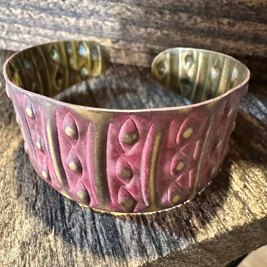Handcrafted Artesian Boho Brass Patina Bracelet, Warm Red Dots & Lines, Adjustable, Gift Box