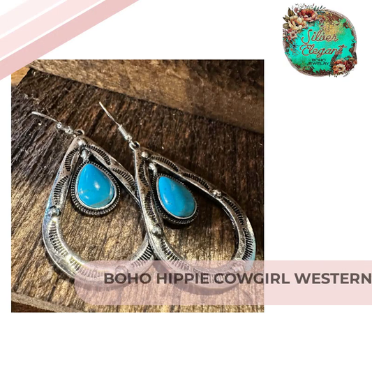 Boho Hippie Cowgirl Western Stamped Turquoise Teardrop Silver Earrings, Gift Box