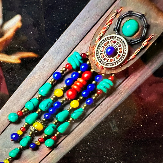 Artisan Boho Beaded Necklace with Vintage Gemstone & Leather Fringe - Perfect Gift
