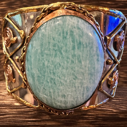 Artisan-Made Adjustable Cuff Bracelet with Amazonite Green Stone and Mixed Metals, Gift-Ready Packaging
