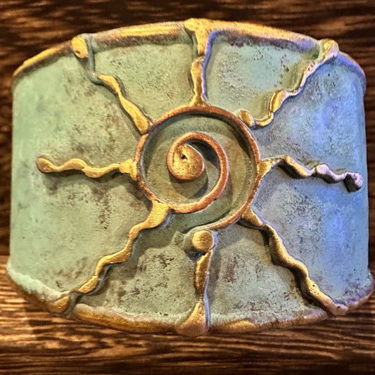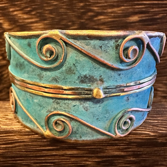 Aqua Patina Swirl Adjustable Cuff Bracelet Handcrafted 2 Inch Wide Brass Gift Boxed