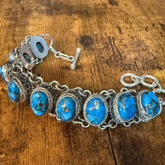 Blue Copper Turquoise Dalhia Gemstone Sterling Silver Vintage Link Bracelet