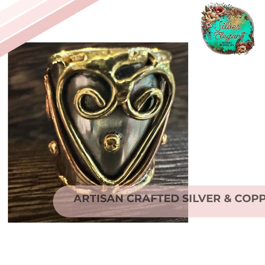 Artisan Crafted Bohemian Silver & Copper Heart Wide Cuff Ring in Gift Box