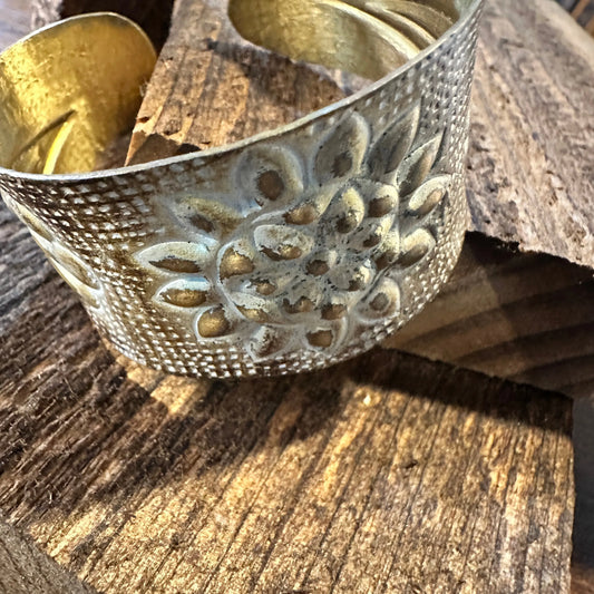 Handcrafted Artesian Boho Brass Patina Bracelet, Chartreuse Floral Scrollwork, Adjustable, Gift Box