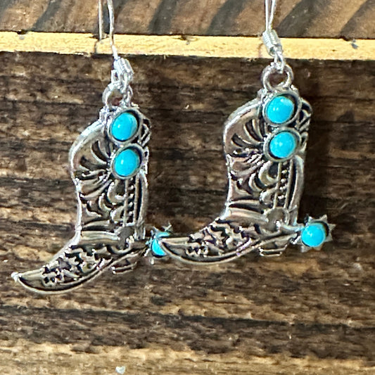 Boho Hippie Western CowgirlTurquoise Stone Boot Silver Drop Wire Earrings, Gift Box