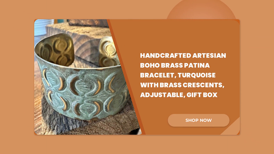 Handcrafted Artesian Boho Brass Patina Bracelet, Turquoise with Brass Crescents, Adjustable, Gift Box