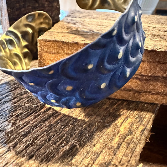 Handcrafted Artesian Boho Brass Patina Bracelet, Cobalt Blue Waves Dots, Adjustable, Gift Box