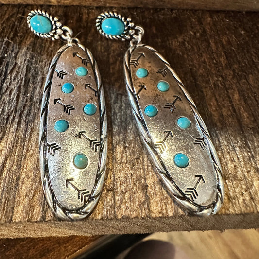 Boho Hippie Cowgirl Western Stamped Turquoise Teardrop Silver Earrings, Gift Box