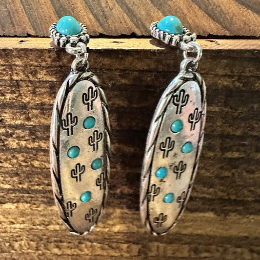 Boho Hippie Cowgirl Western Stamped Stone Silver Earrings - Cactus Turquoise, Gift Box