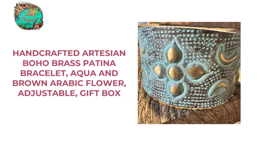 Handcrafted Artesian Boho Brass Patina Bracelet, Aqua and Brown Arabic Flower, Adjustable, Gift Box