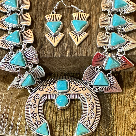 Blue Turquoise Stone Squash Blossom Necklace, Faux Silver Pearl Beads