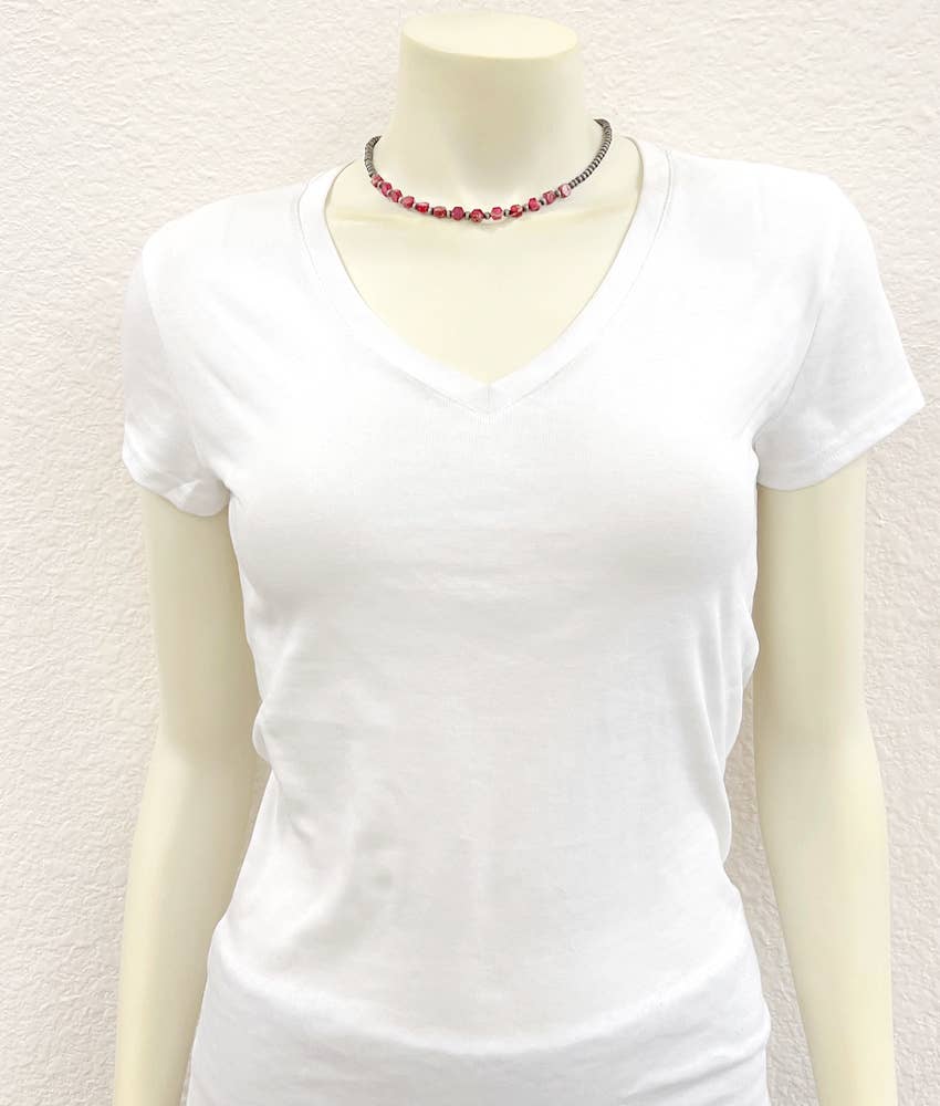 The Navajo Hexa Gemstone Necklace is a stunning piece of handmade jewelry that showcases a vibrant combination of multi-color beads and exquisite hexagonal gemstones. At 16 inches long with a 5-inch extender, this necklace is perfect for layering or wearing alone, making it a versatile addition to any jewelry collection.