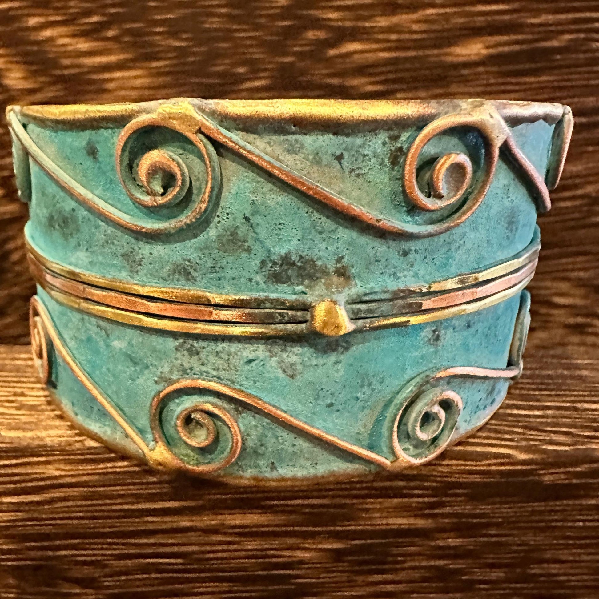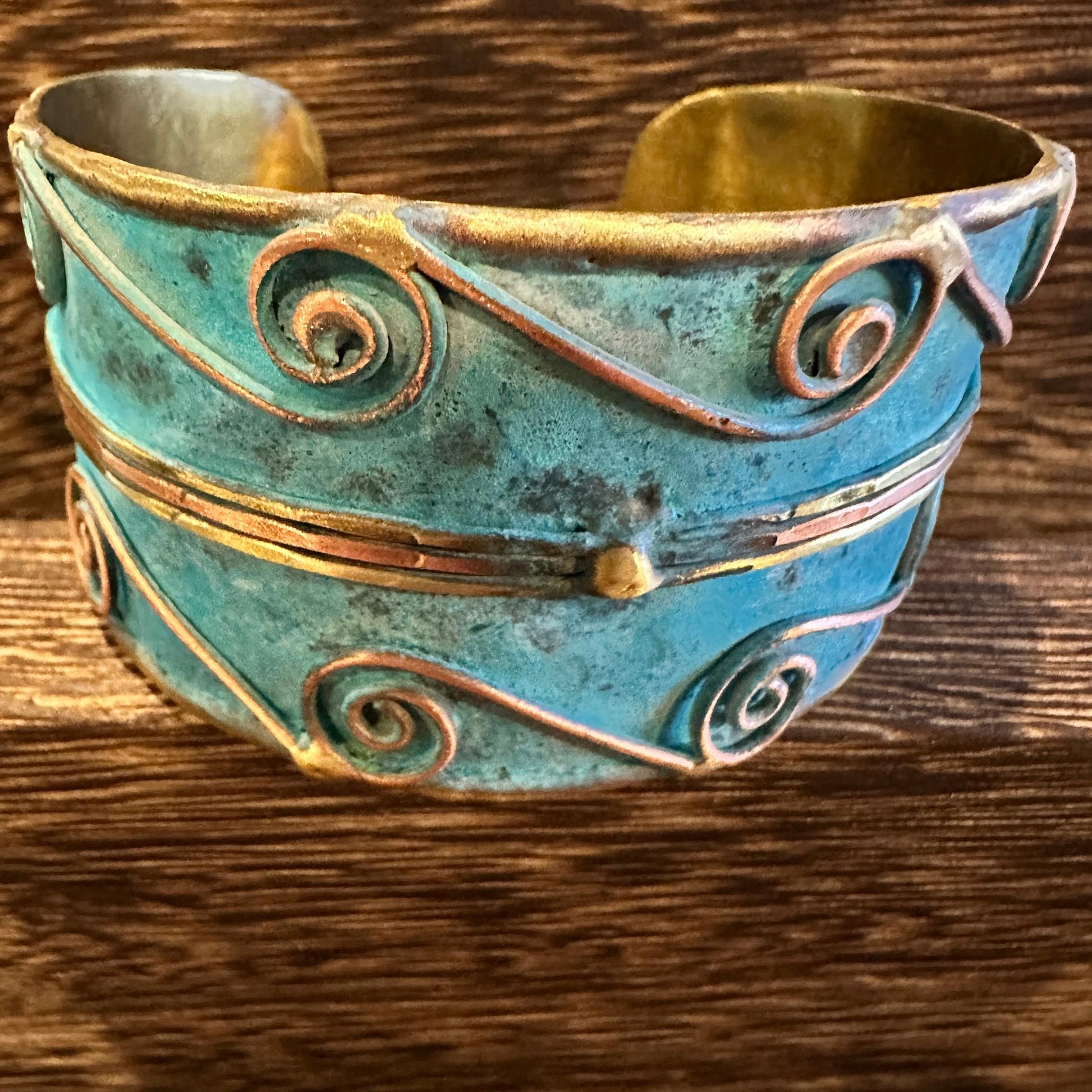 Aqua Patina Swirl Adjustable Cuff Bracelet Handcrafted 2 Inch Wide Brass Gift Boxed