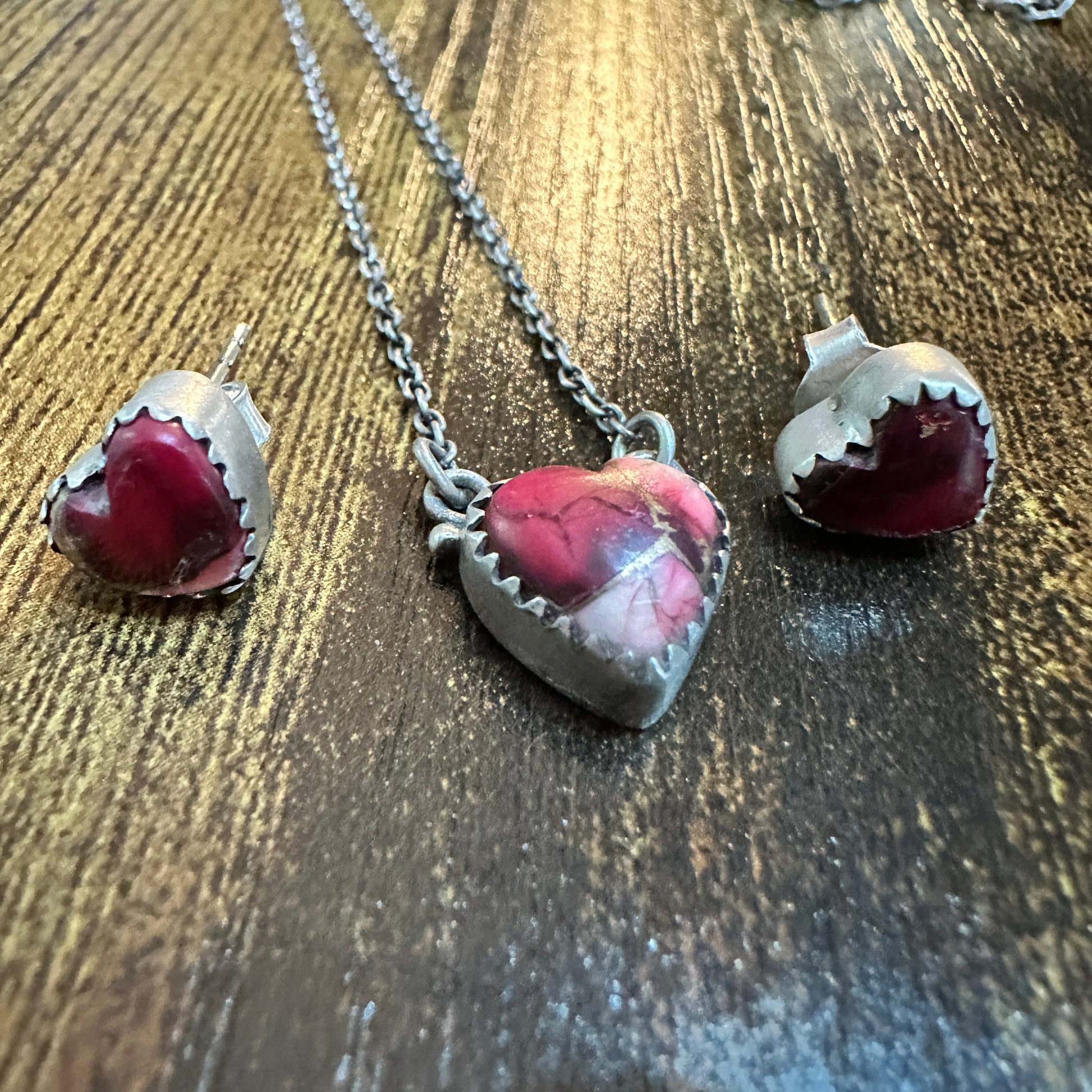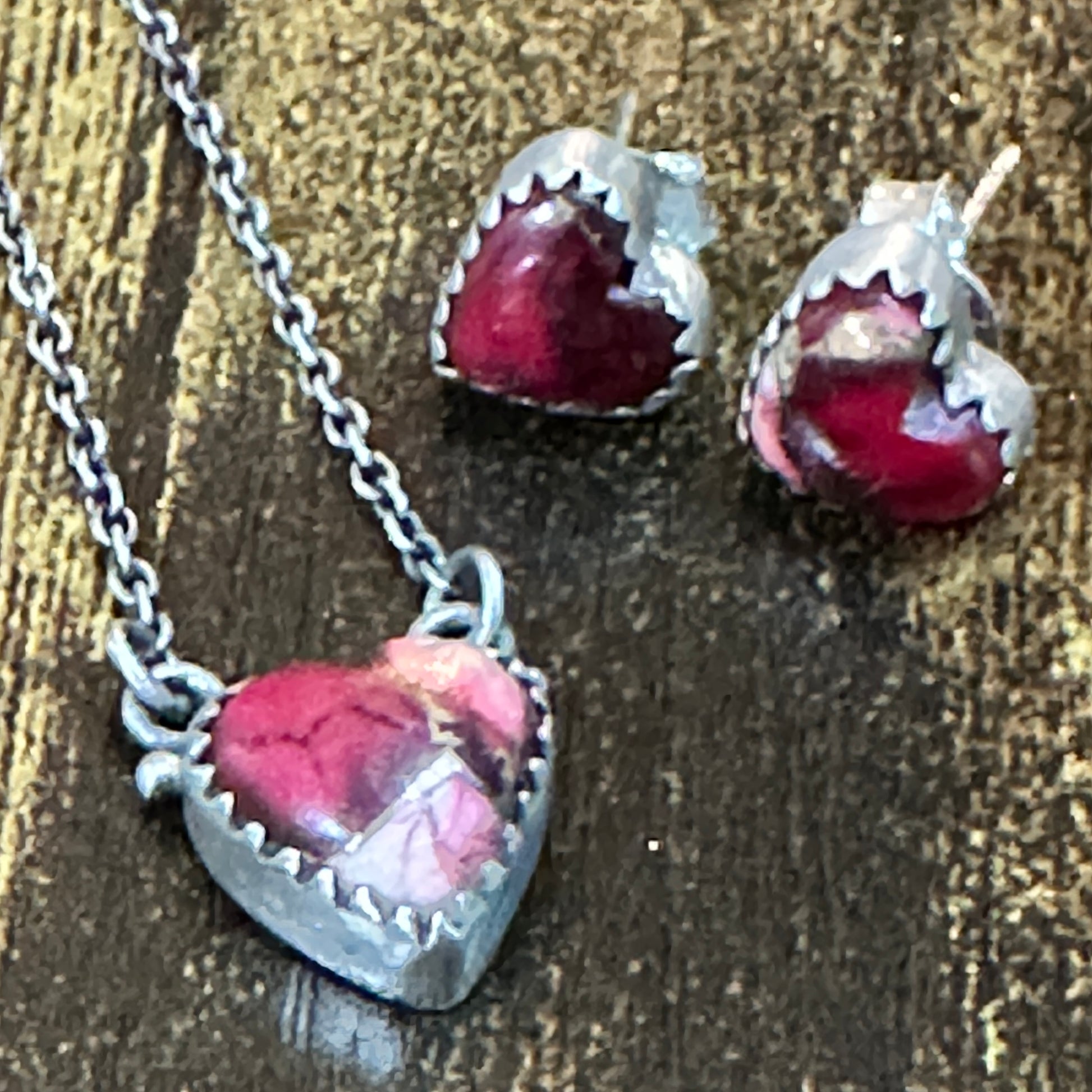 - Handmade sterling silver necklace and matching earrings featuring a delicate heart-shaped dahlia rose design, with natural stones whose coloring will vary for a one-of-a-kind allure.