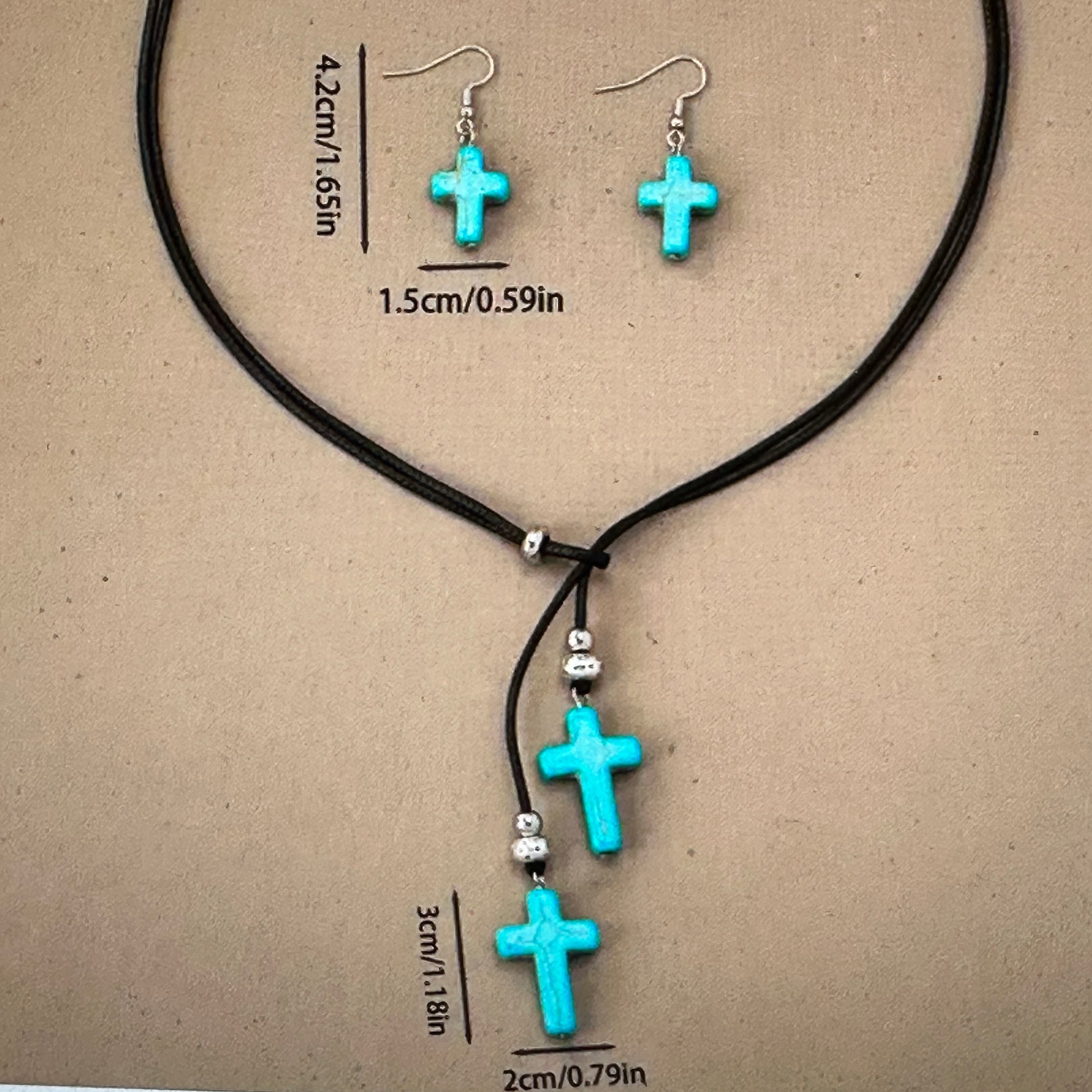 Introducing the Black Cord Faux Turquoise Cross Choker Necklace And Earrings Set — a bold, boho-chic duo that adds color and intrigue to any ensemble.