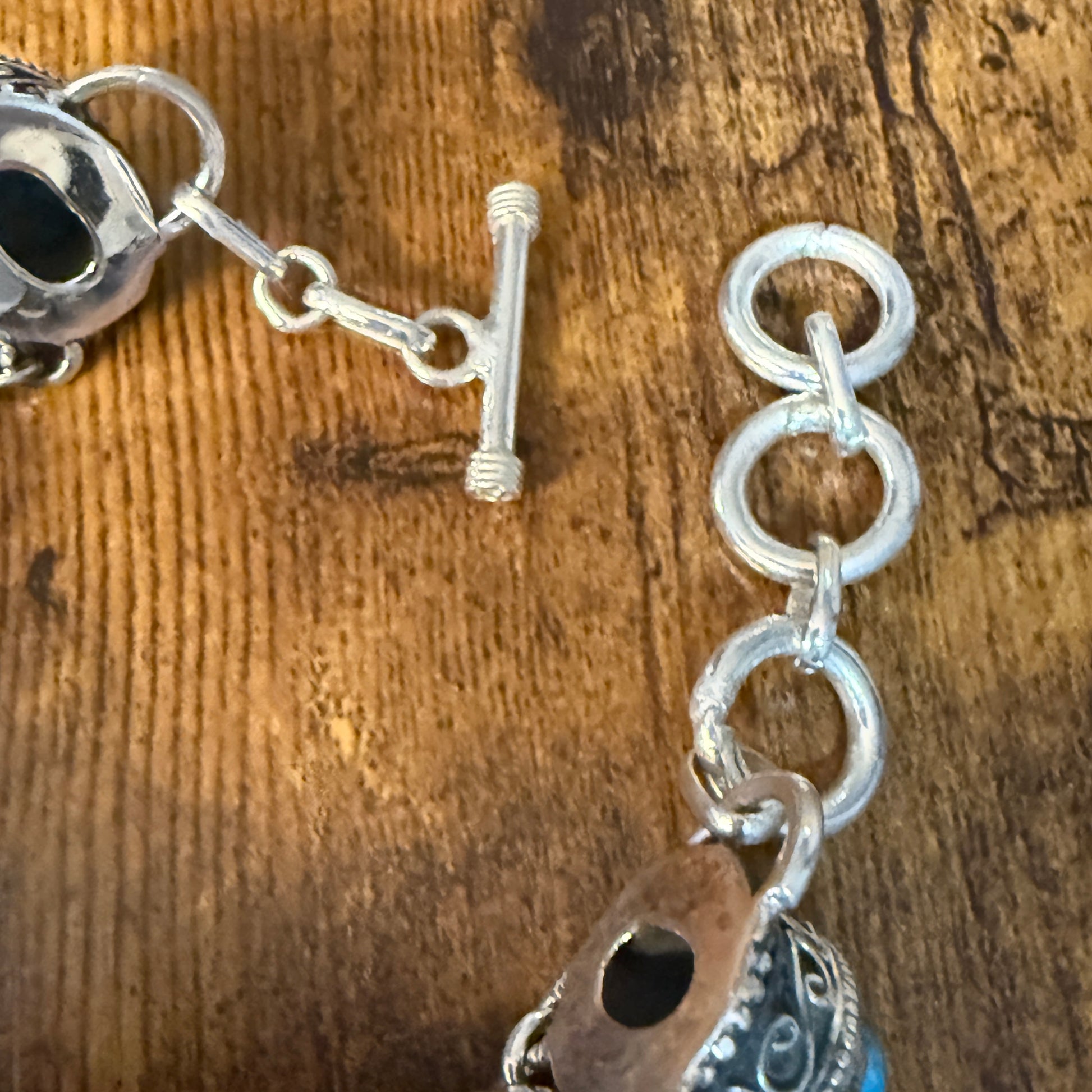 - Blue Copper Turquoise Dalhia gemstone centerpiece set in polished sterling silver links for a bold, artisanal look.