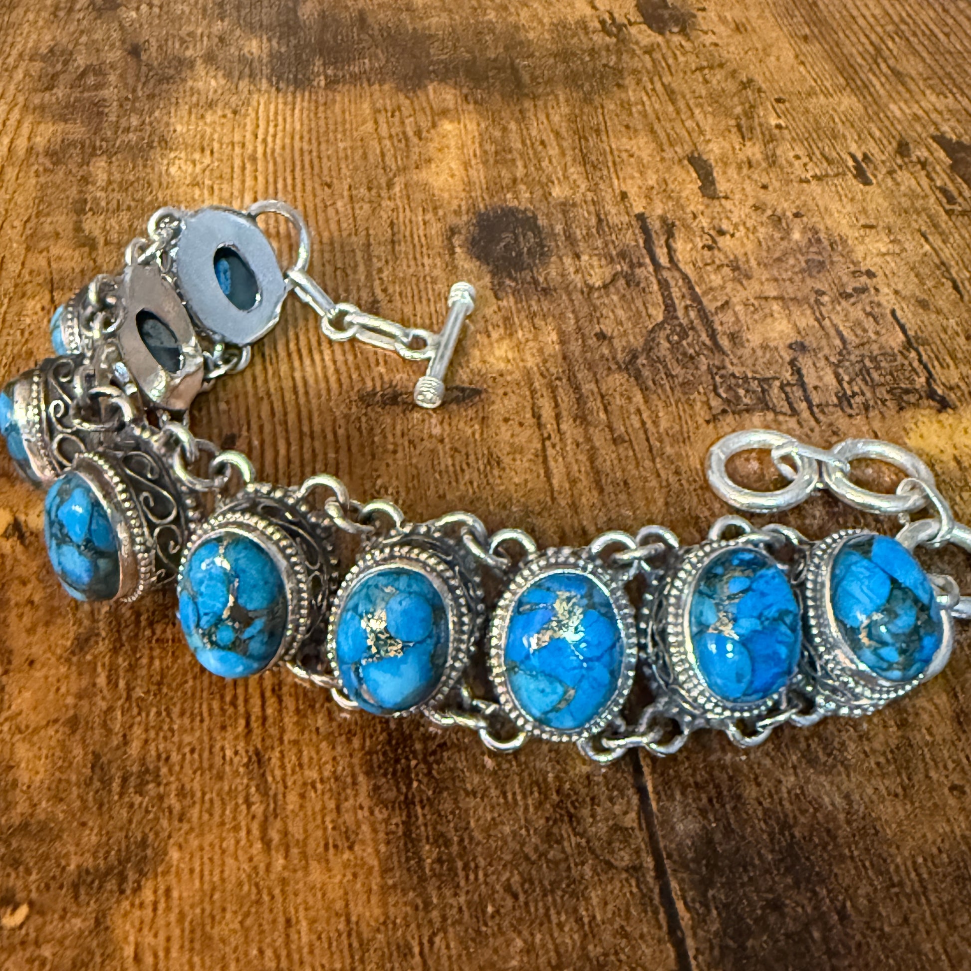 Blue Copper Turquoise Dalhia Gemstone Sterling Silver Vintage Link Bracelet
