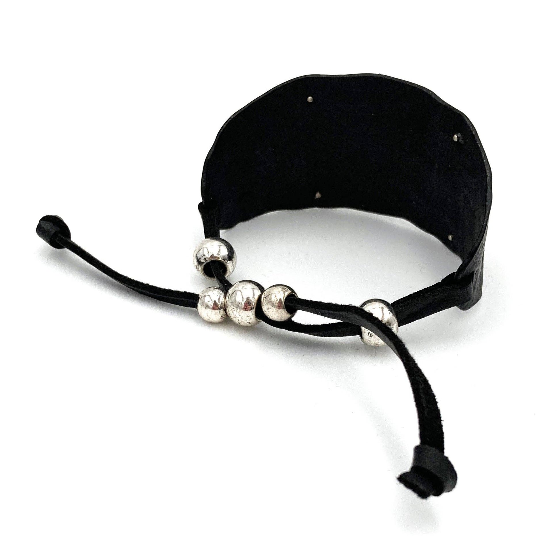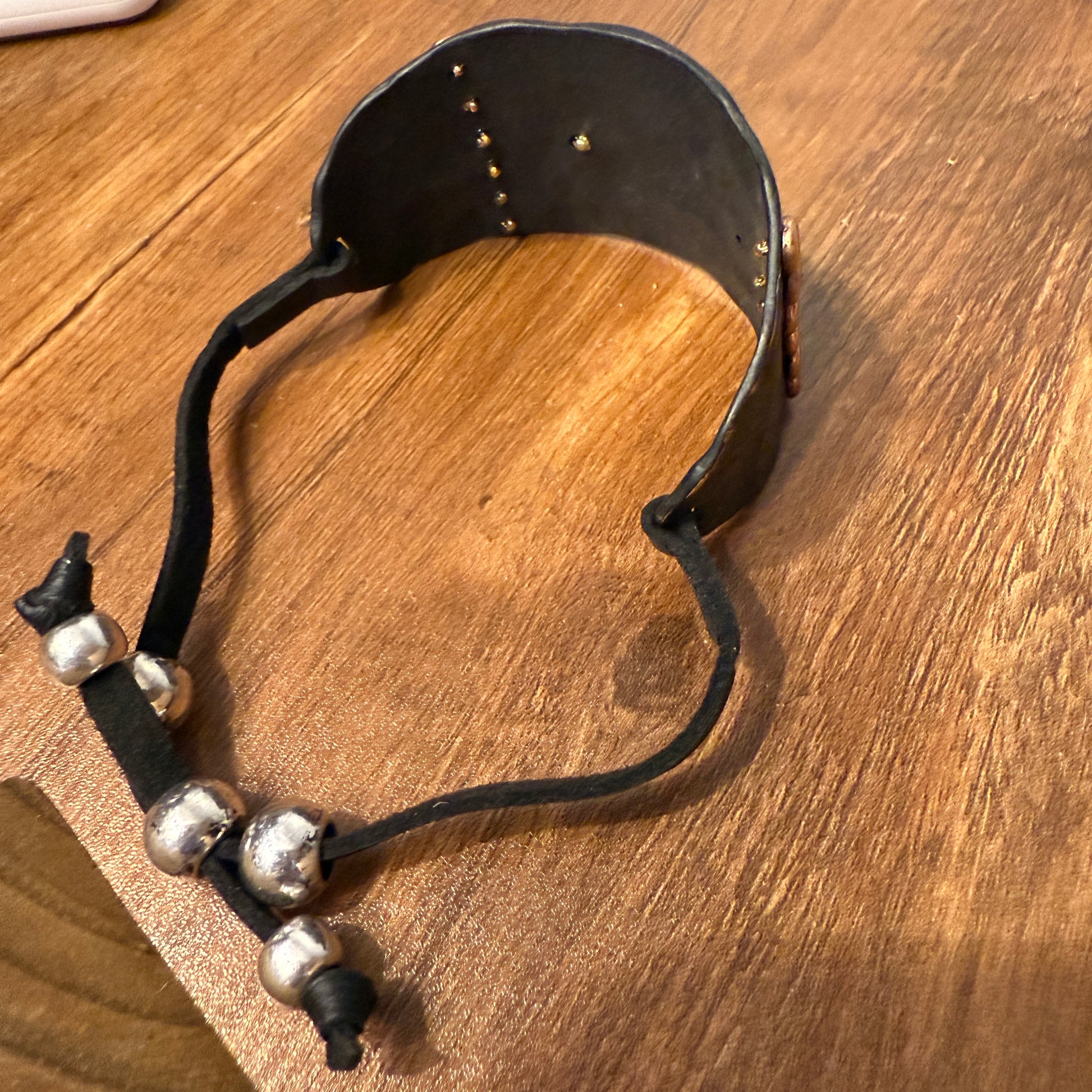 - Adjustable leather straps in patina turquoise blue and dark brown for a comfortable, secure fit on most wrists.