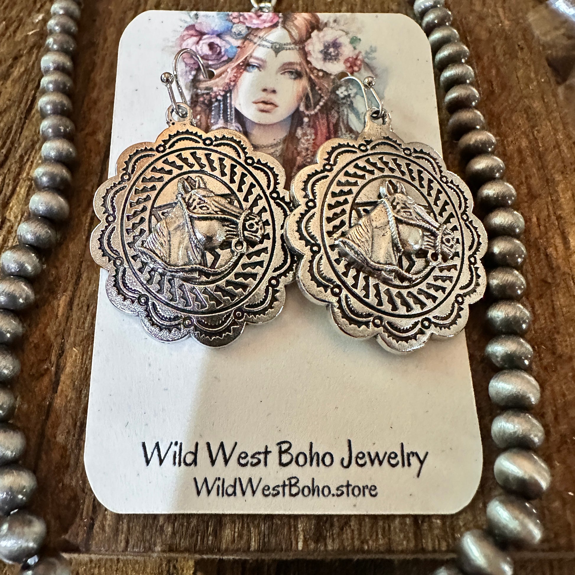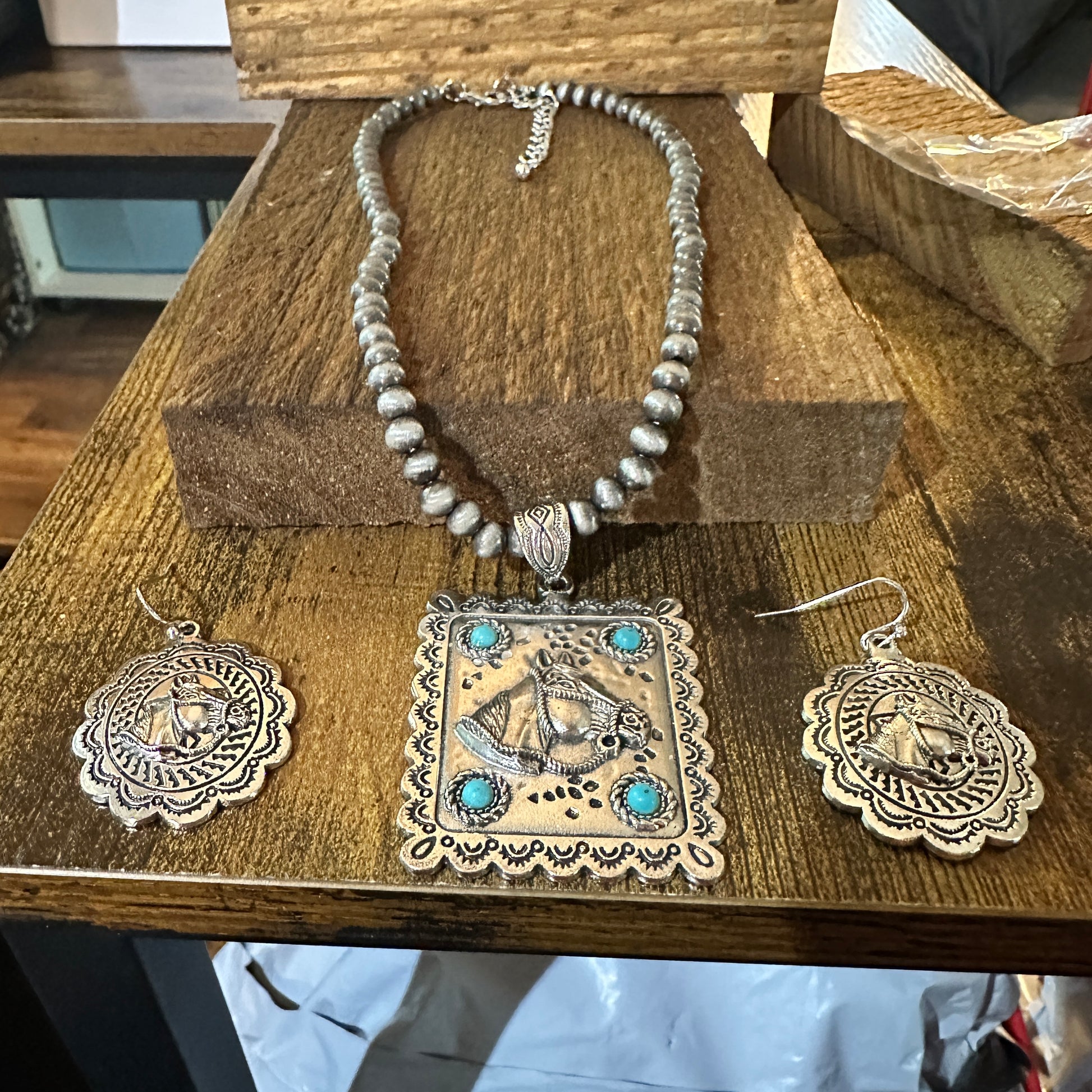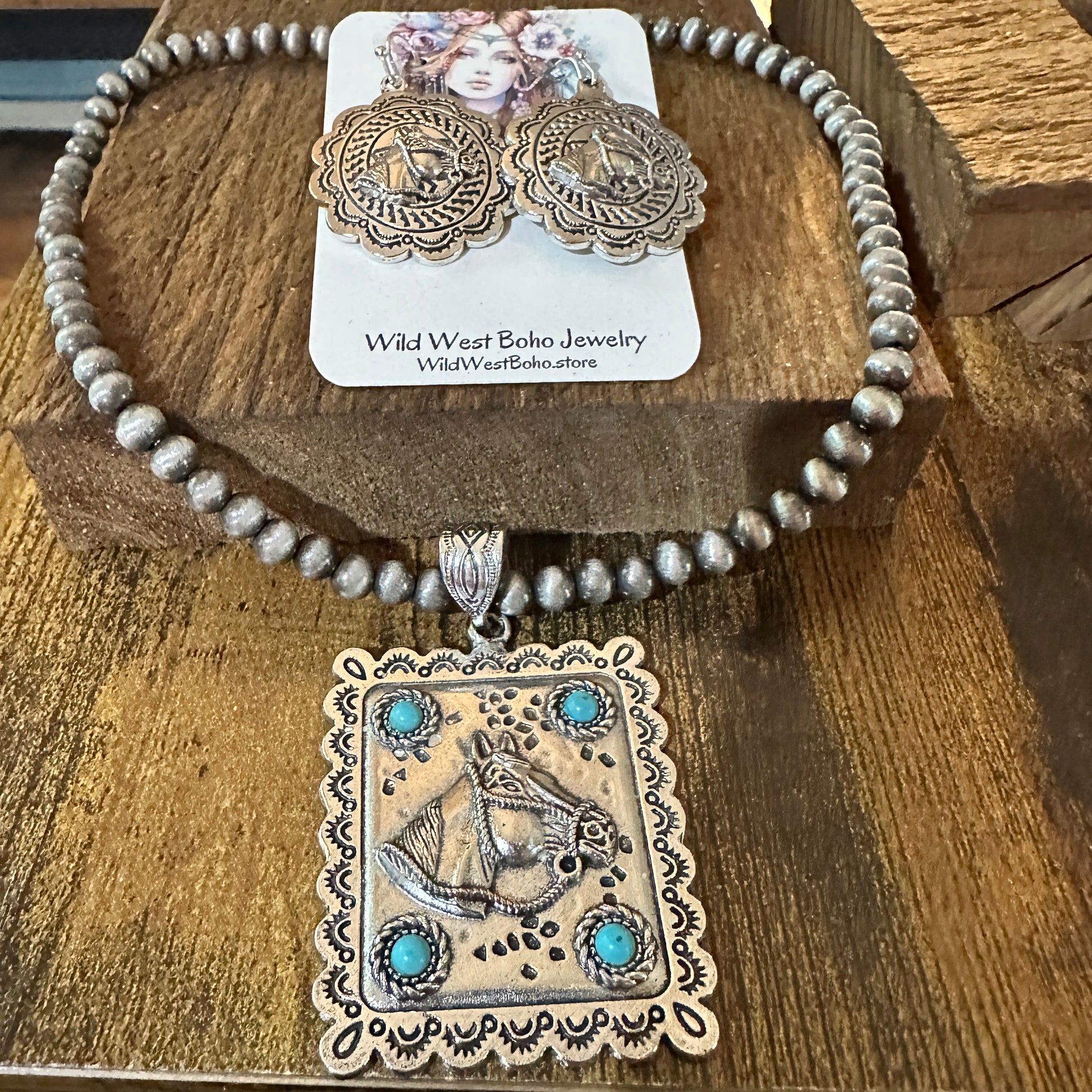 - Coordinated sophistication — faux silver pearl necklace paired with matching horse pendant earrings for a unified, polished look.