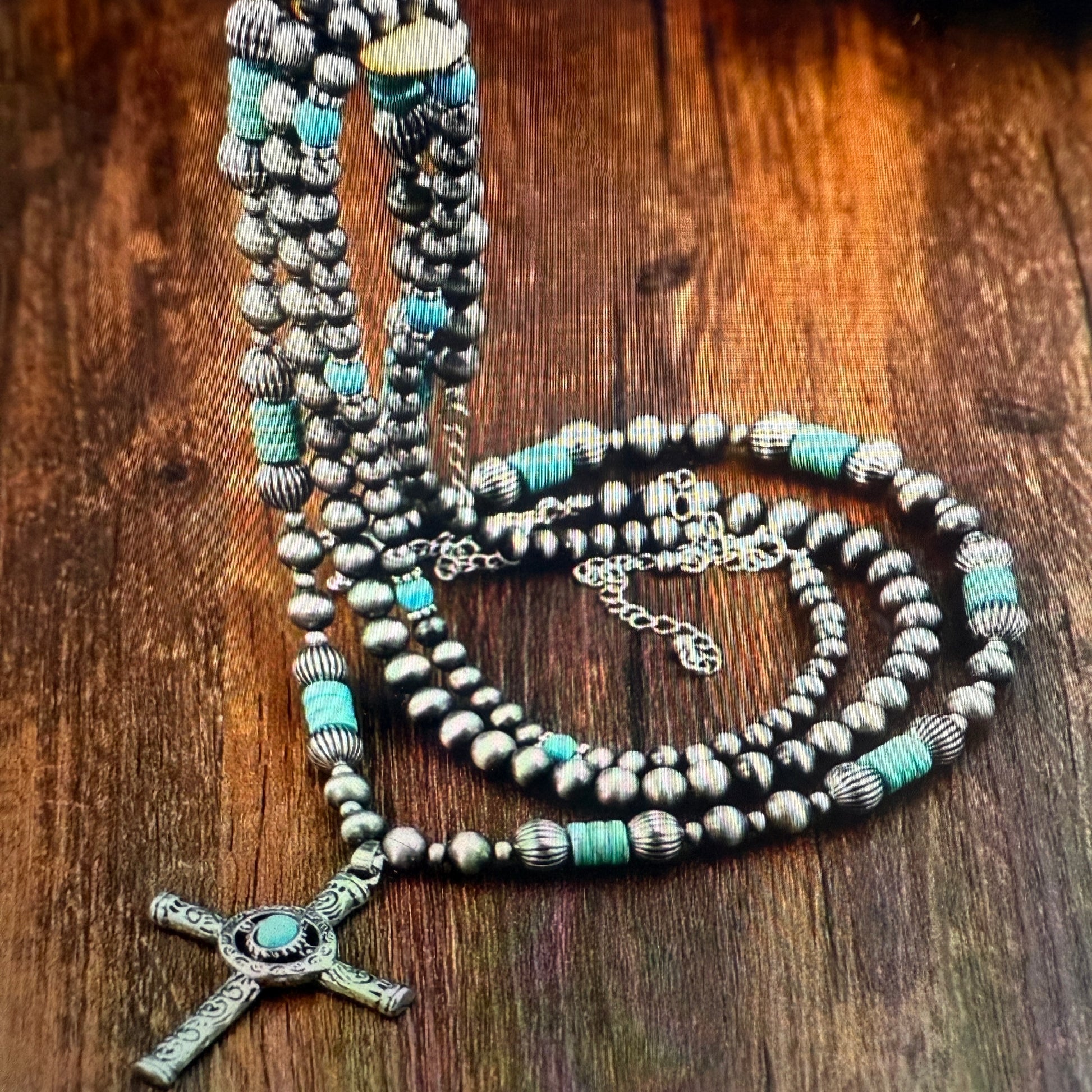 - Two-layer necklace set featuring a faux turquoise bead cross pendant for a trendy, boho-chic look.