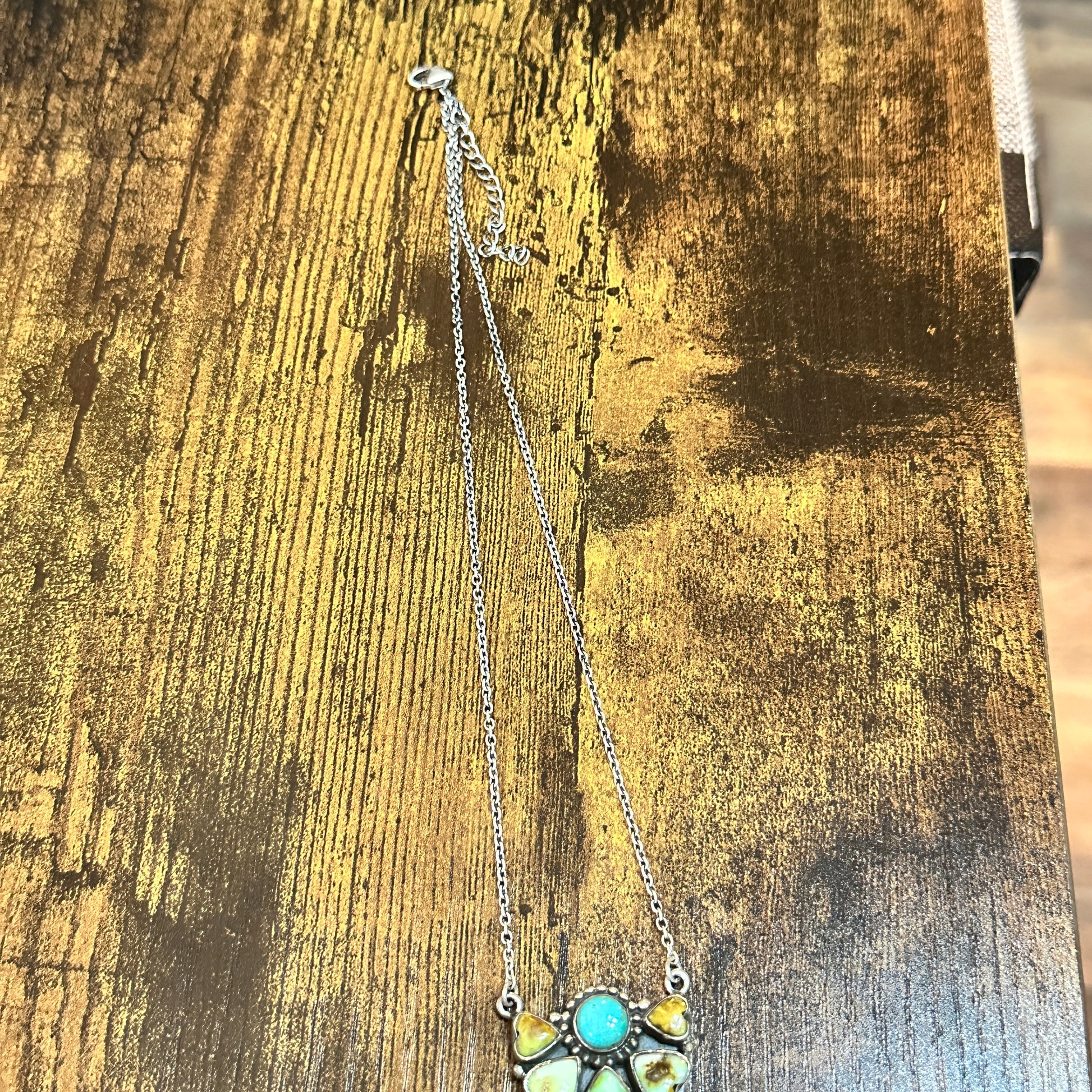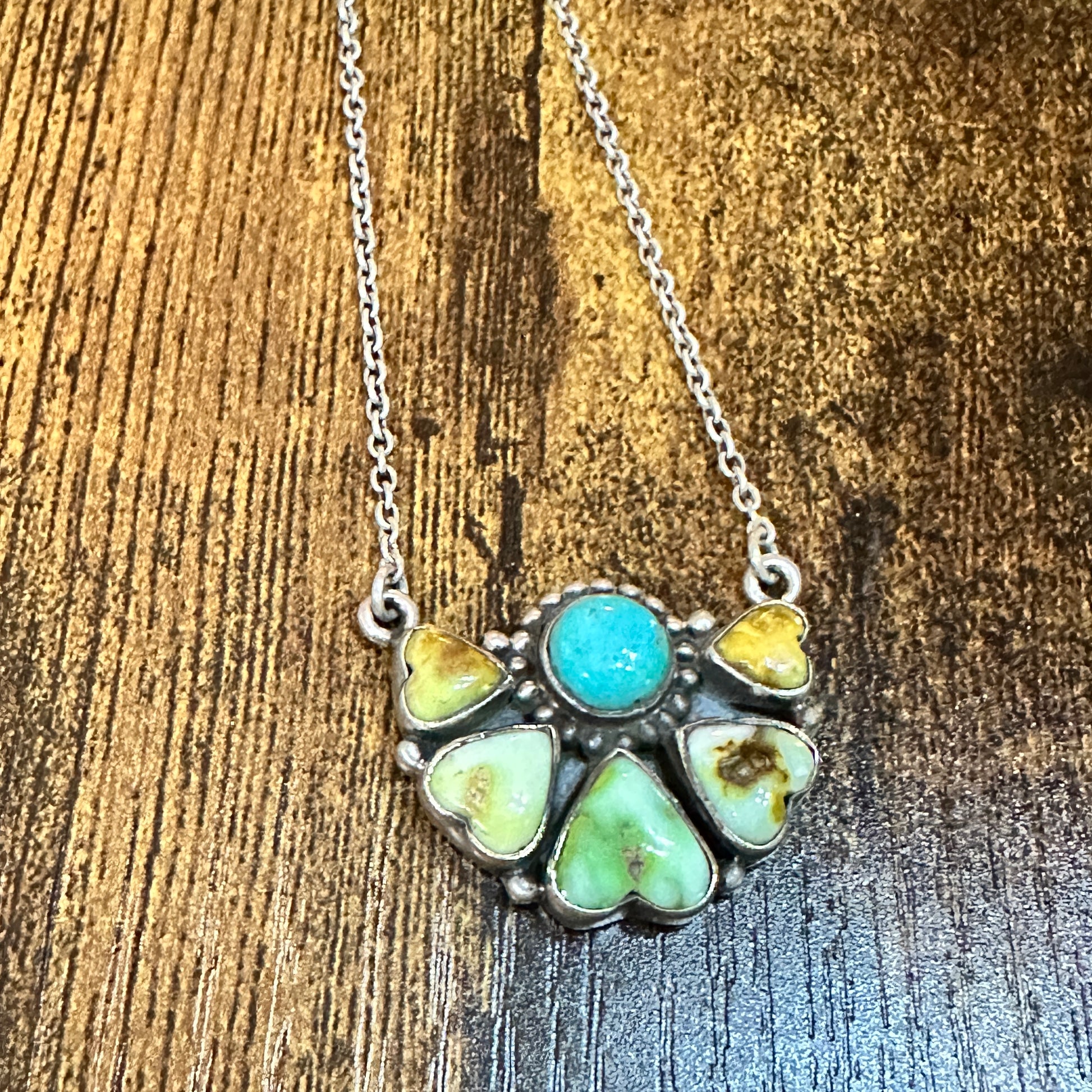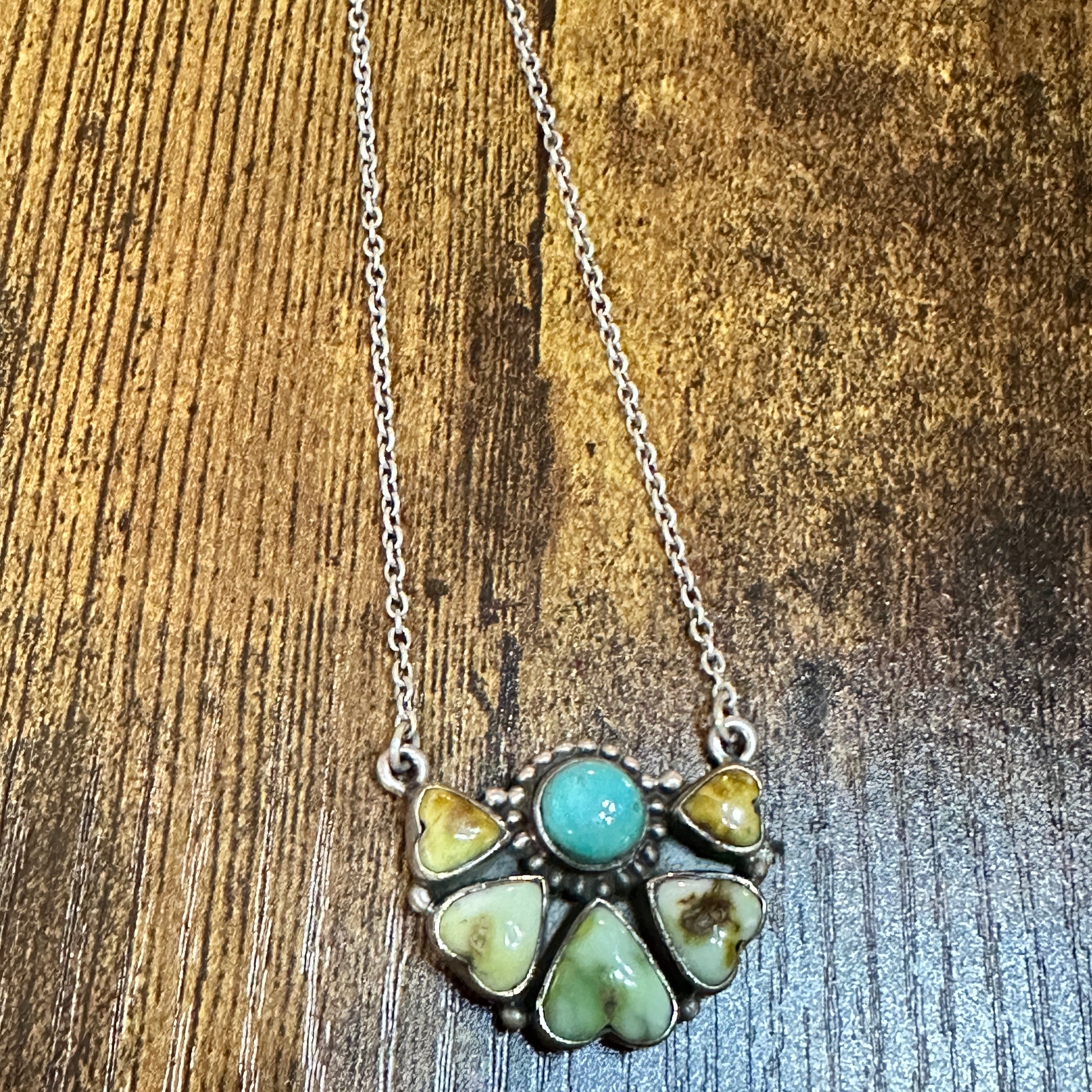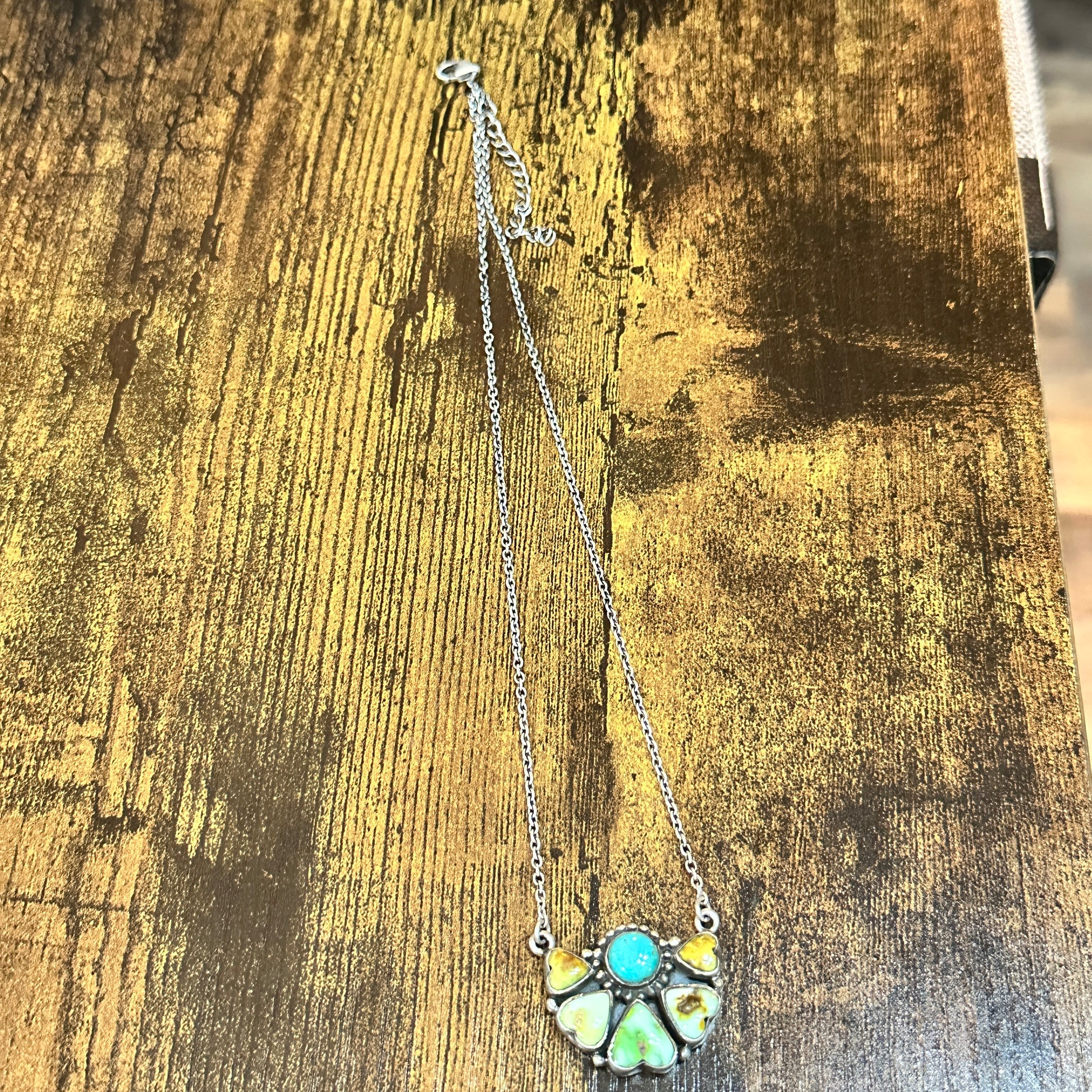 Elegant and timeless, the Nizhoni Crescent Heart Turquoise Necklace blends handcrafted sterling silver with vibrant turquoise stones for a statement piece that transitions from day to night.