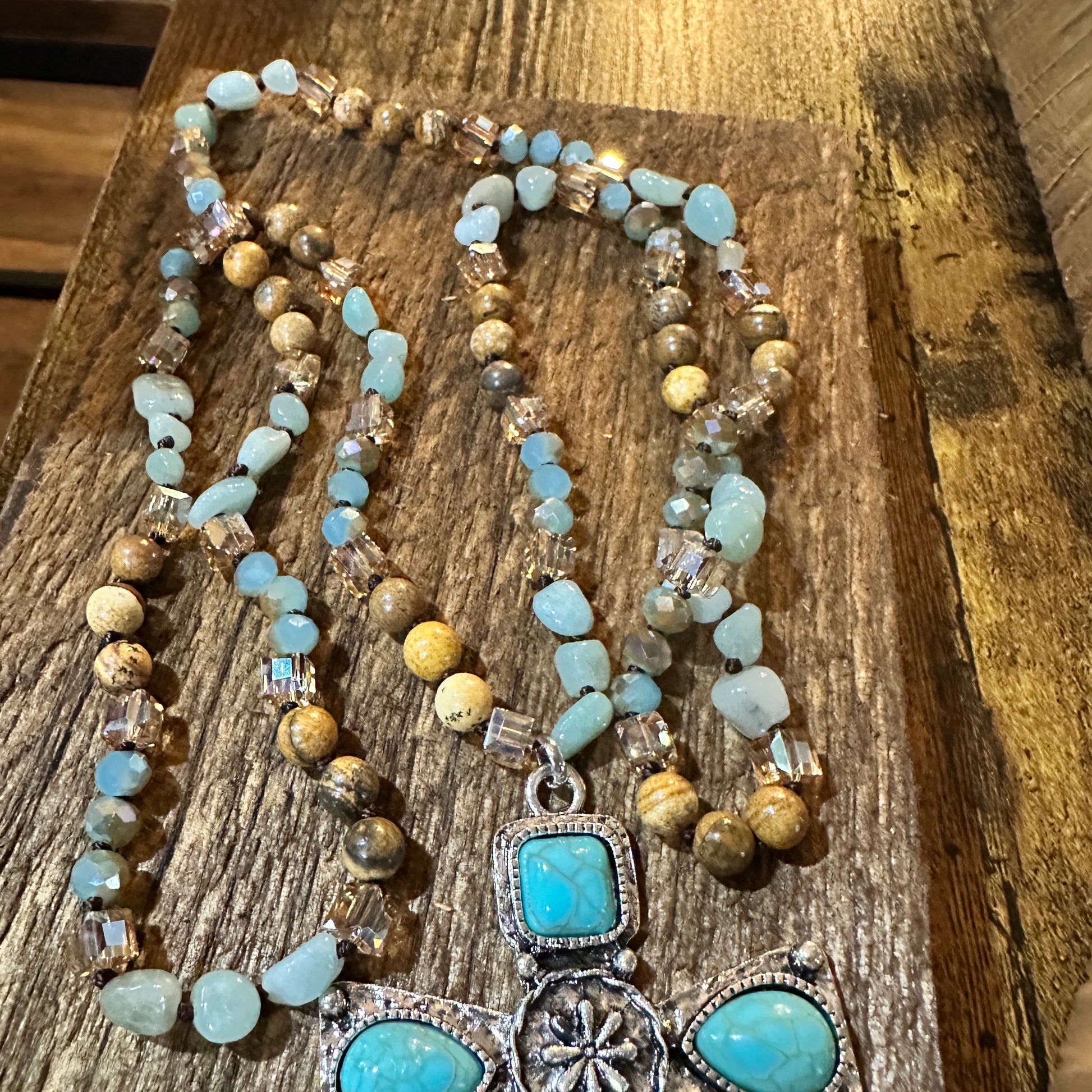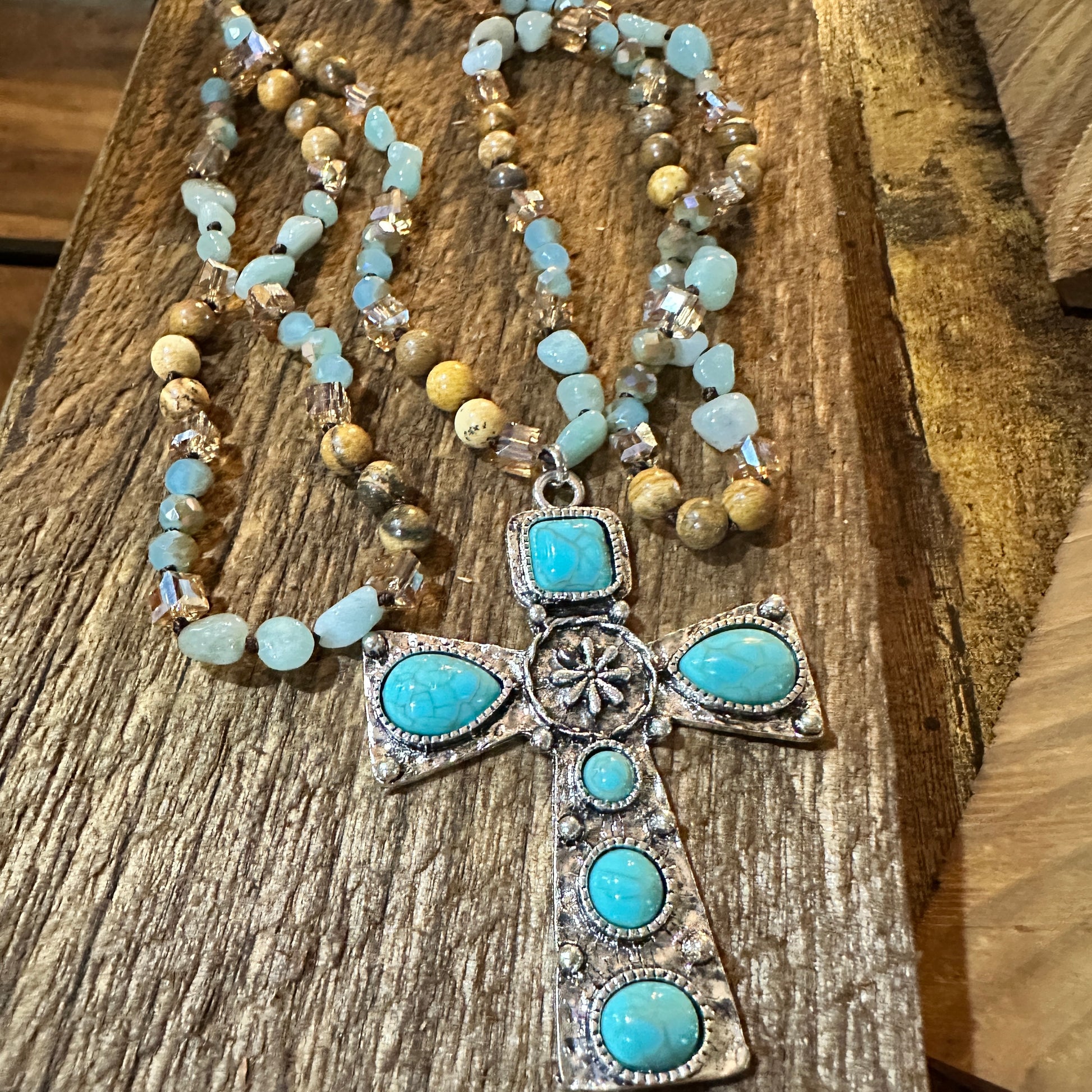 Beaded Turquoise Cross Necklace With Mixed Metals — a 32-inch statement piece blending vibrant turquoise tones with mixed-metal accents for everyday chic and versatile styling.