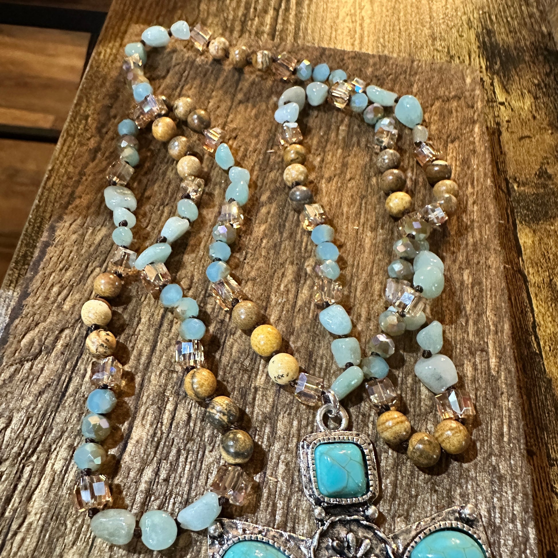 - 32-inch beaded necklace featuring turquoise-toned beads with mixed-metal accents and a bold cross centerpiece for a modern boho vibe.