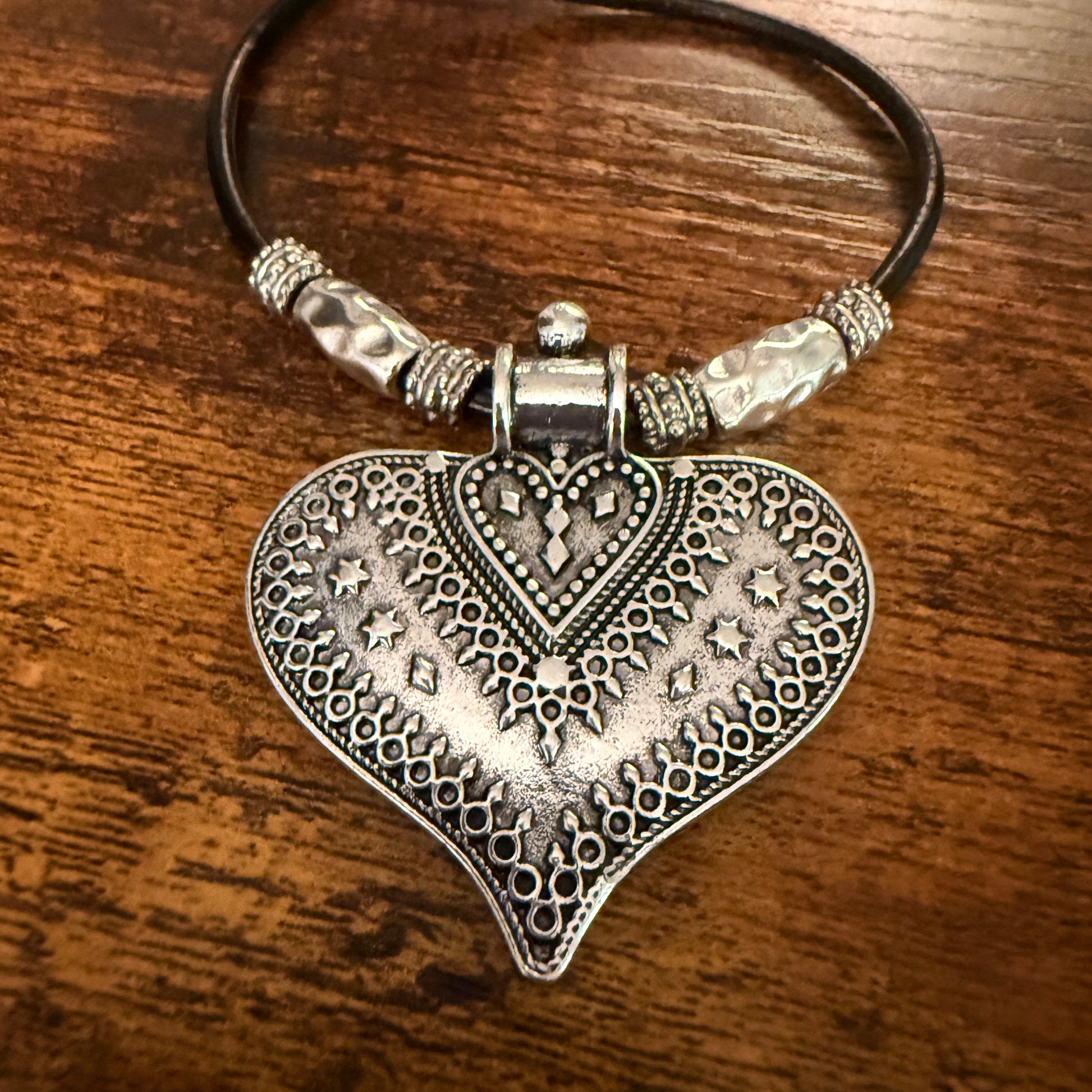 Handcrafted Black Cord Heart Pendant Choker Necklace With Mixed Metals: a chic, artisan piece that blends contemporary edge with timeless elegance.