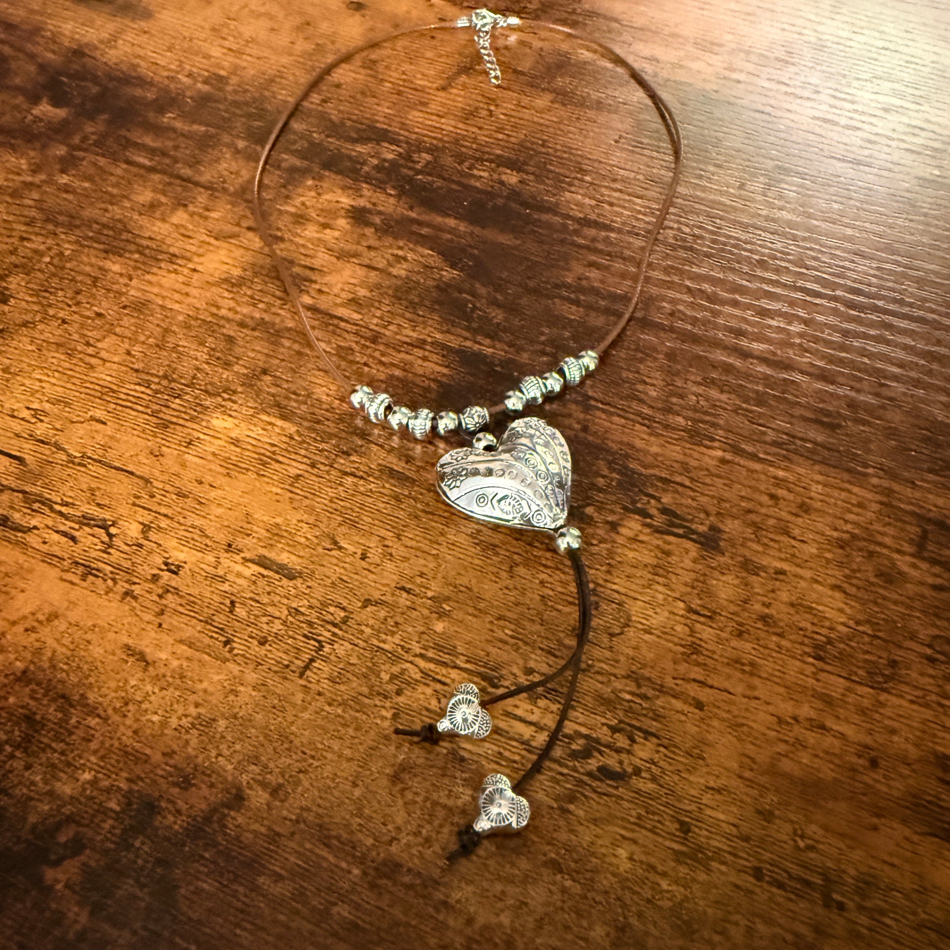 Handcrafted Brown Cord Heart Choker Necklace Mixed Metals