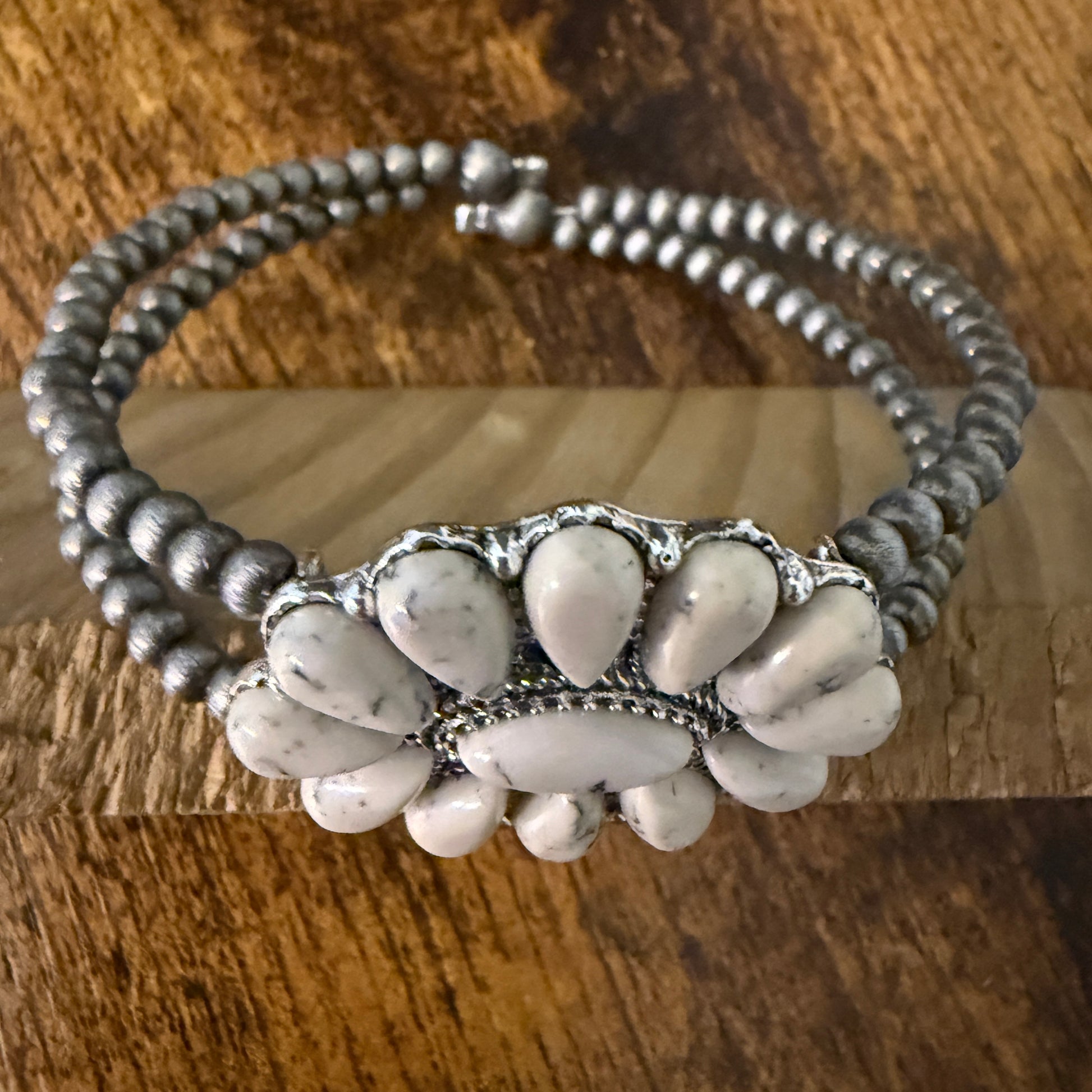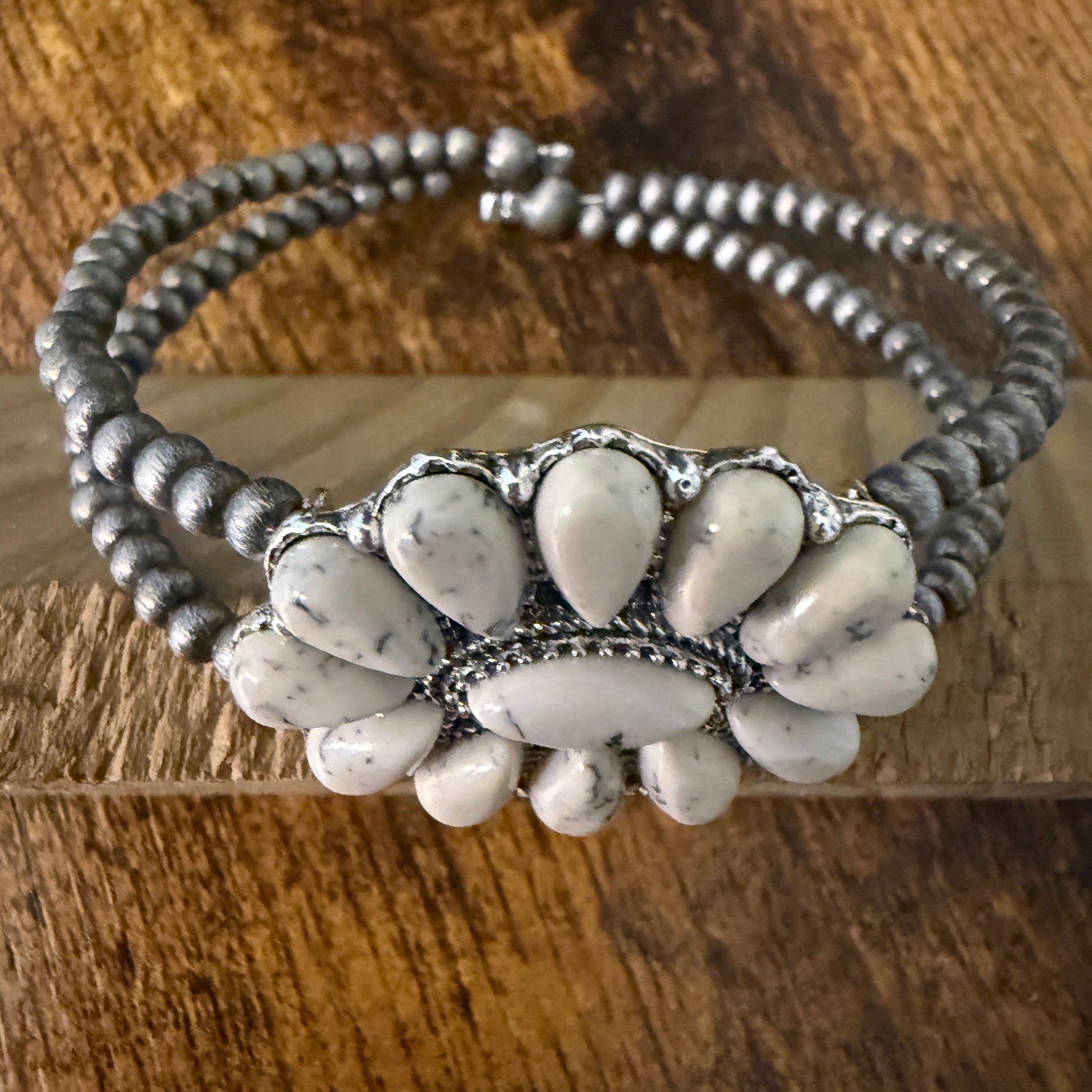Handcrafted Cowgirl Faux White Stone Cluster Silver Pearl Bangle Bracelet