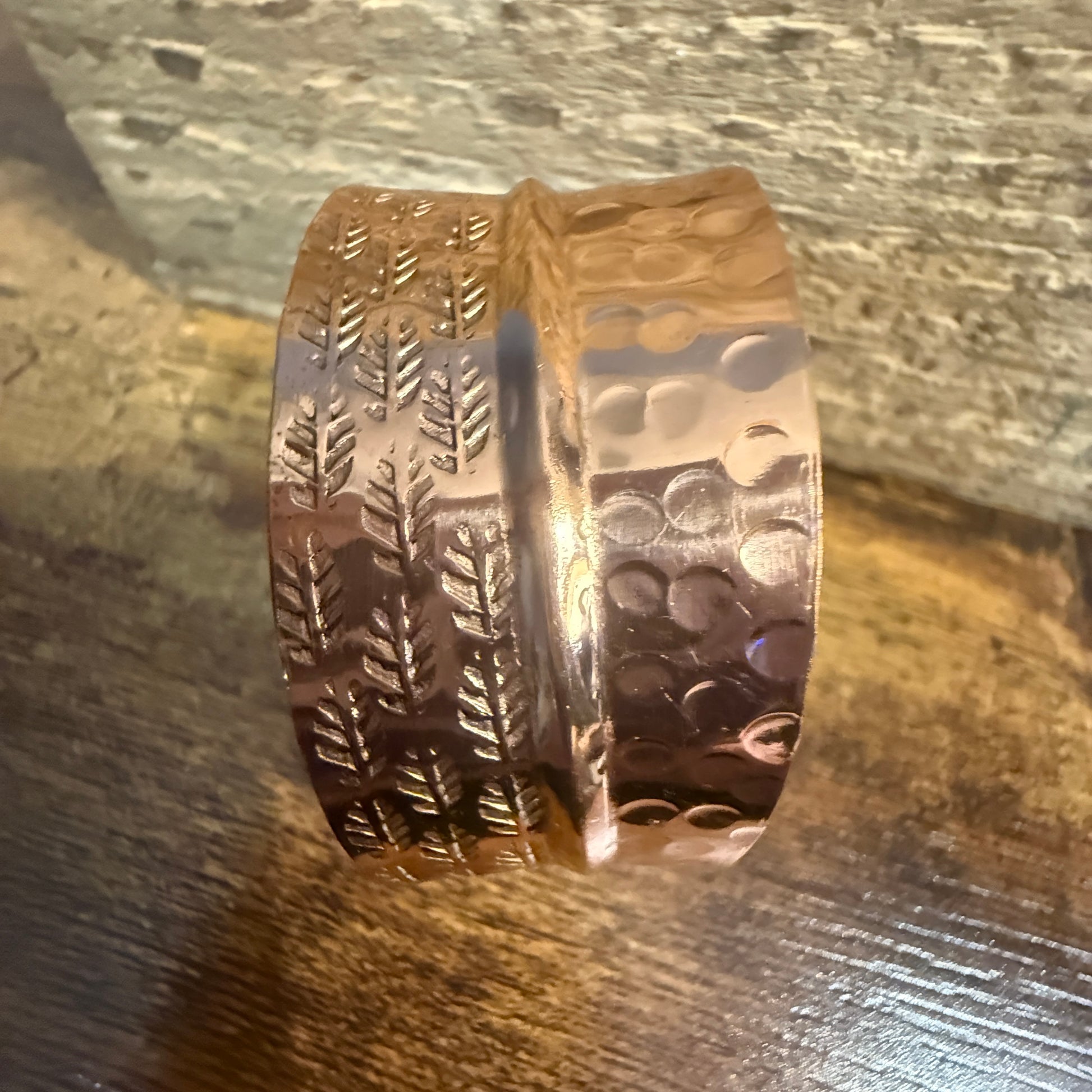 - Dual-texture design blends a hammered top with a crosshatched band for rich dimension and standout texture.