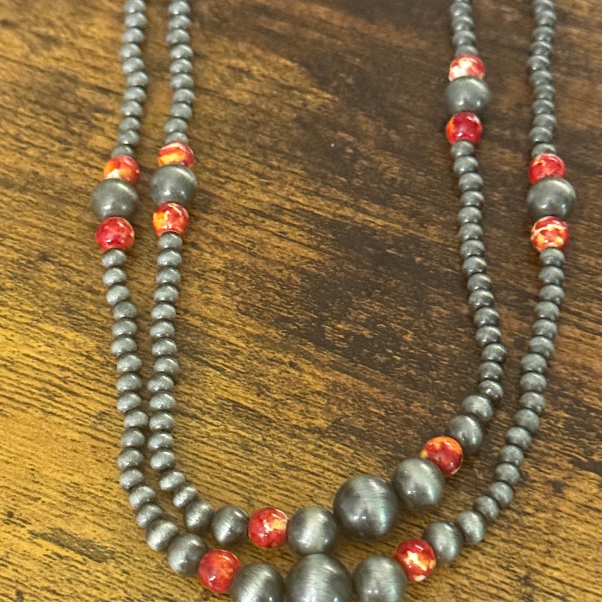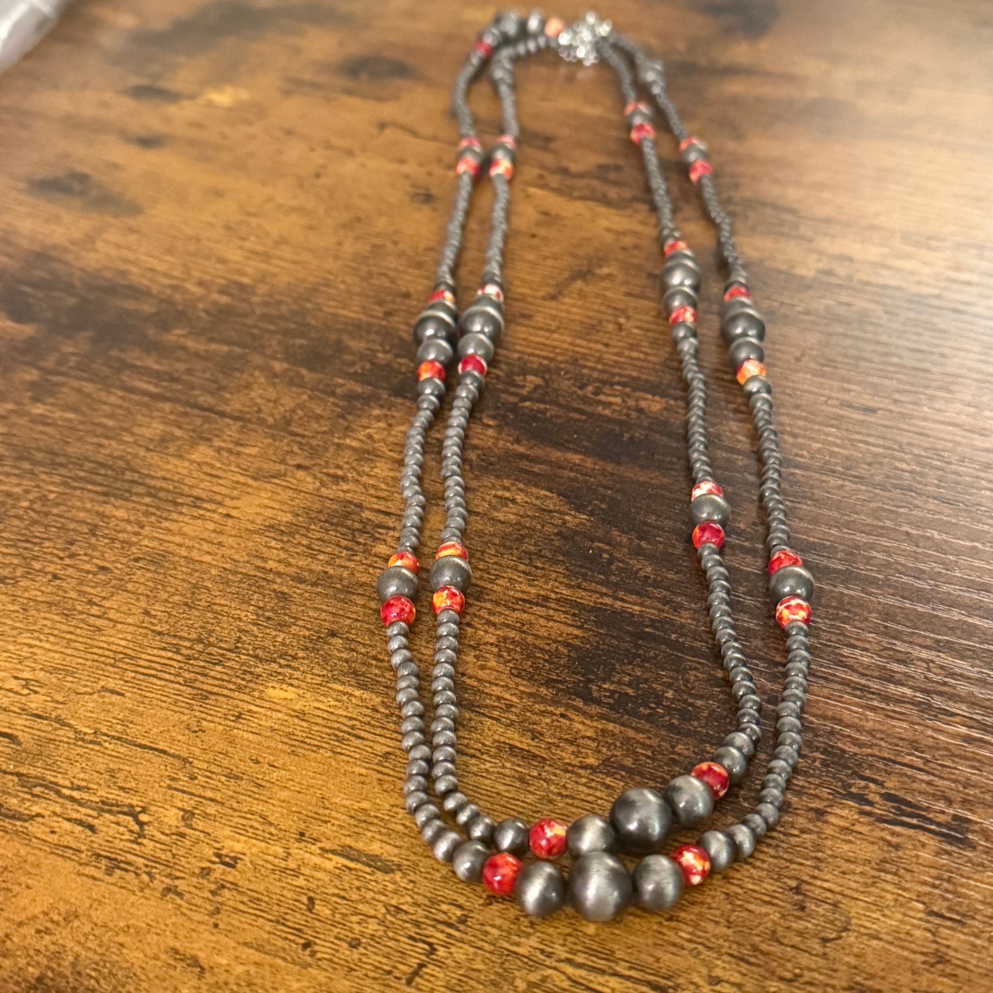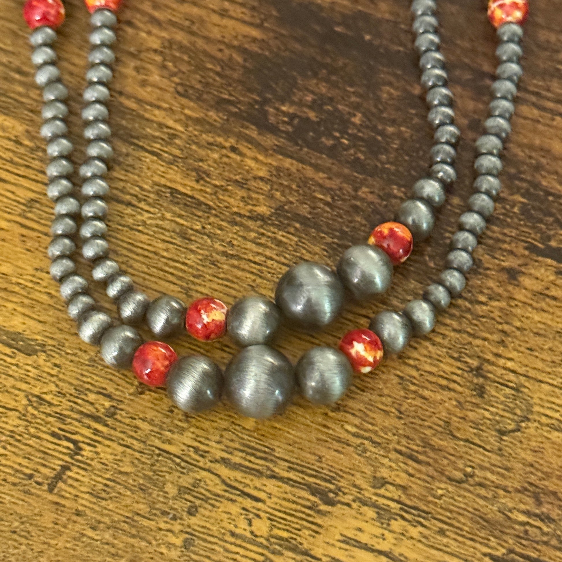 Elevate your jewelry collection with a handcrafted red faux pearl necklace featuring silver accents—a bold statement piece that blends refined artistry with timeless versatility.