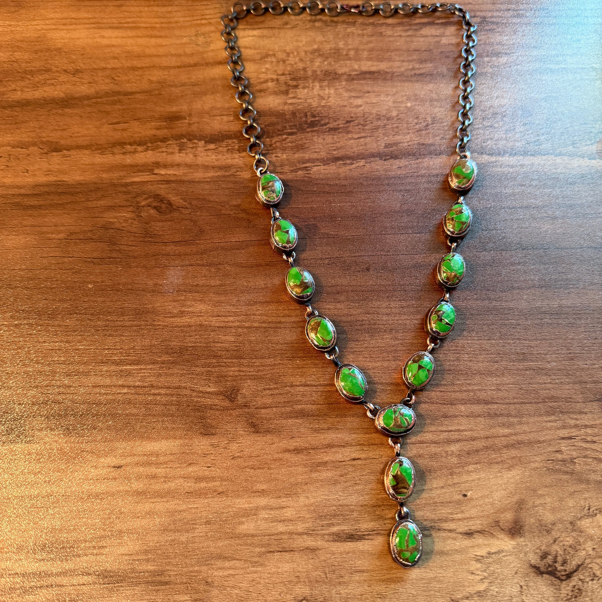 - 18-inch copper chain rests at the collarbone, creating a flattering silhouette that highlights the cool turquoise tones.