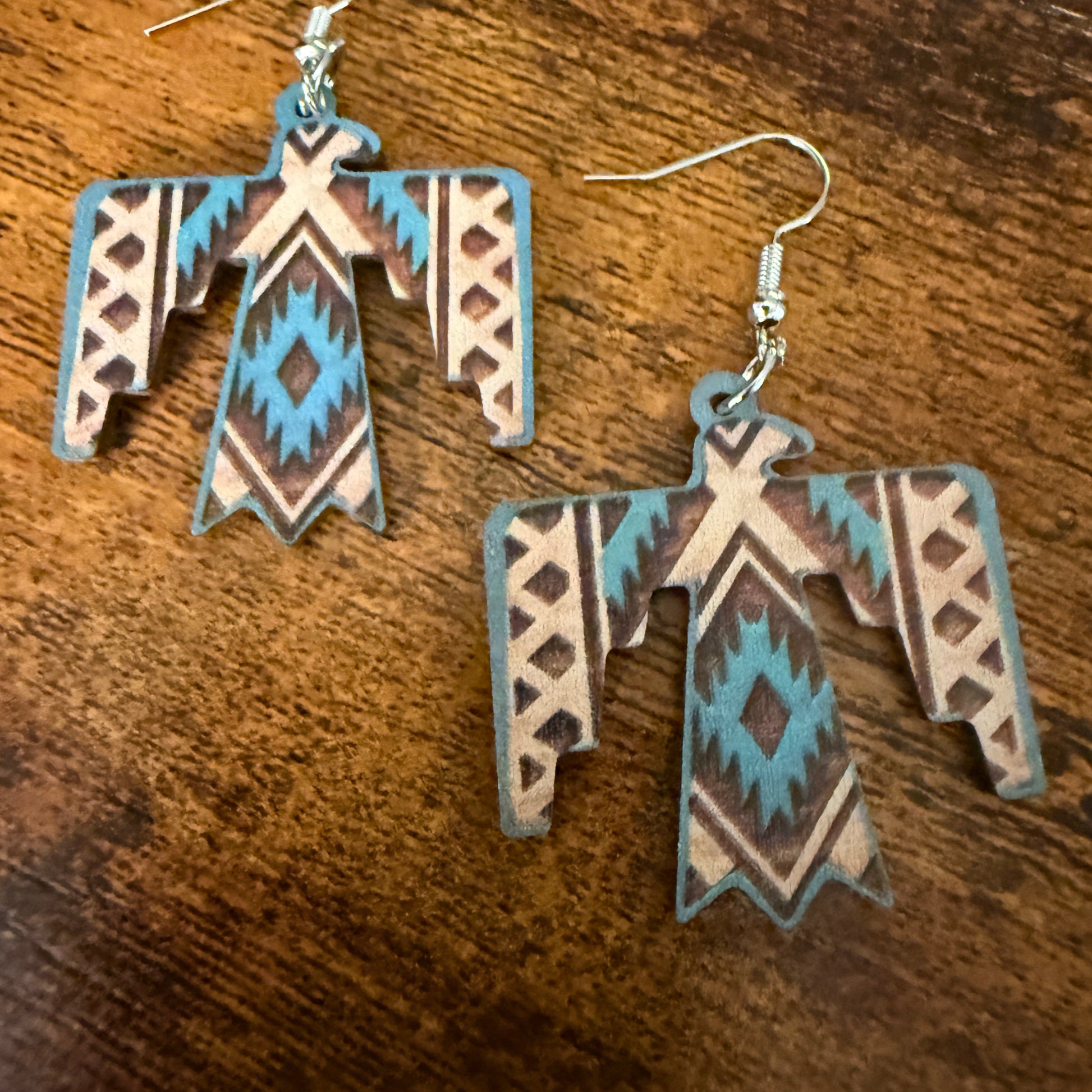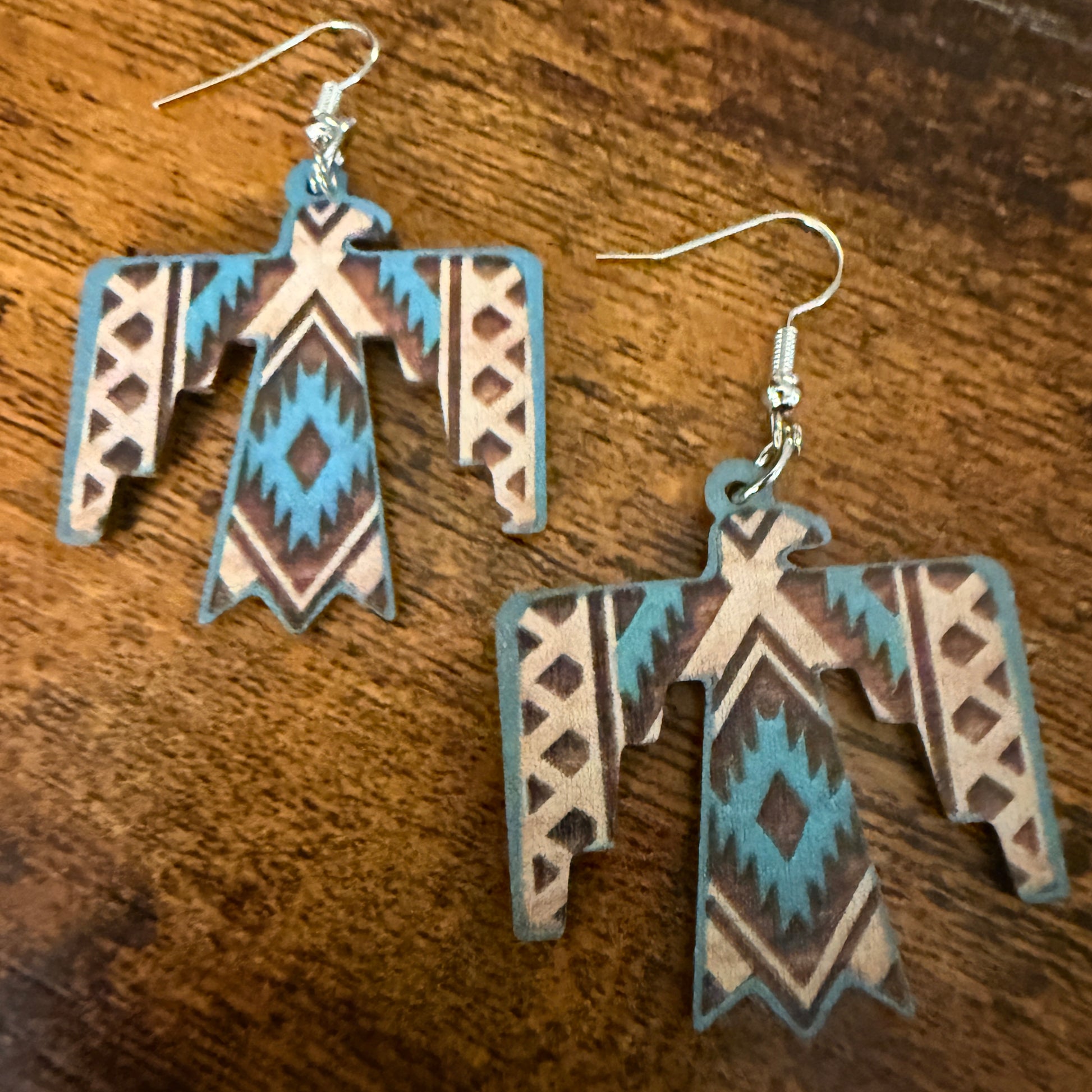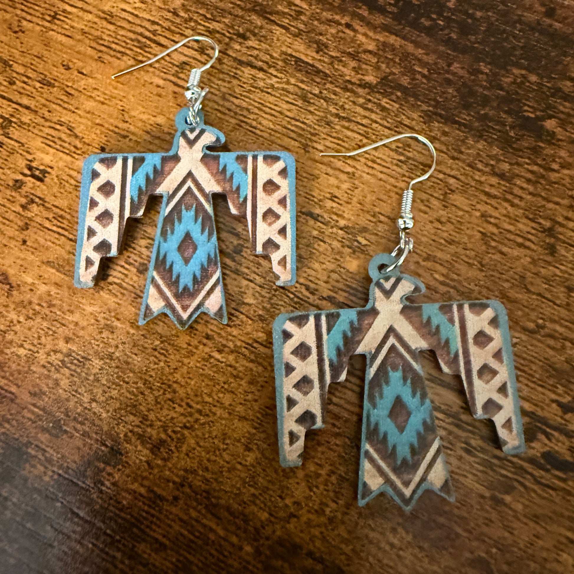 Handcrafted Wooden Thunderbird Wire Drop Earrings Artisanal Sustainable Wood