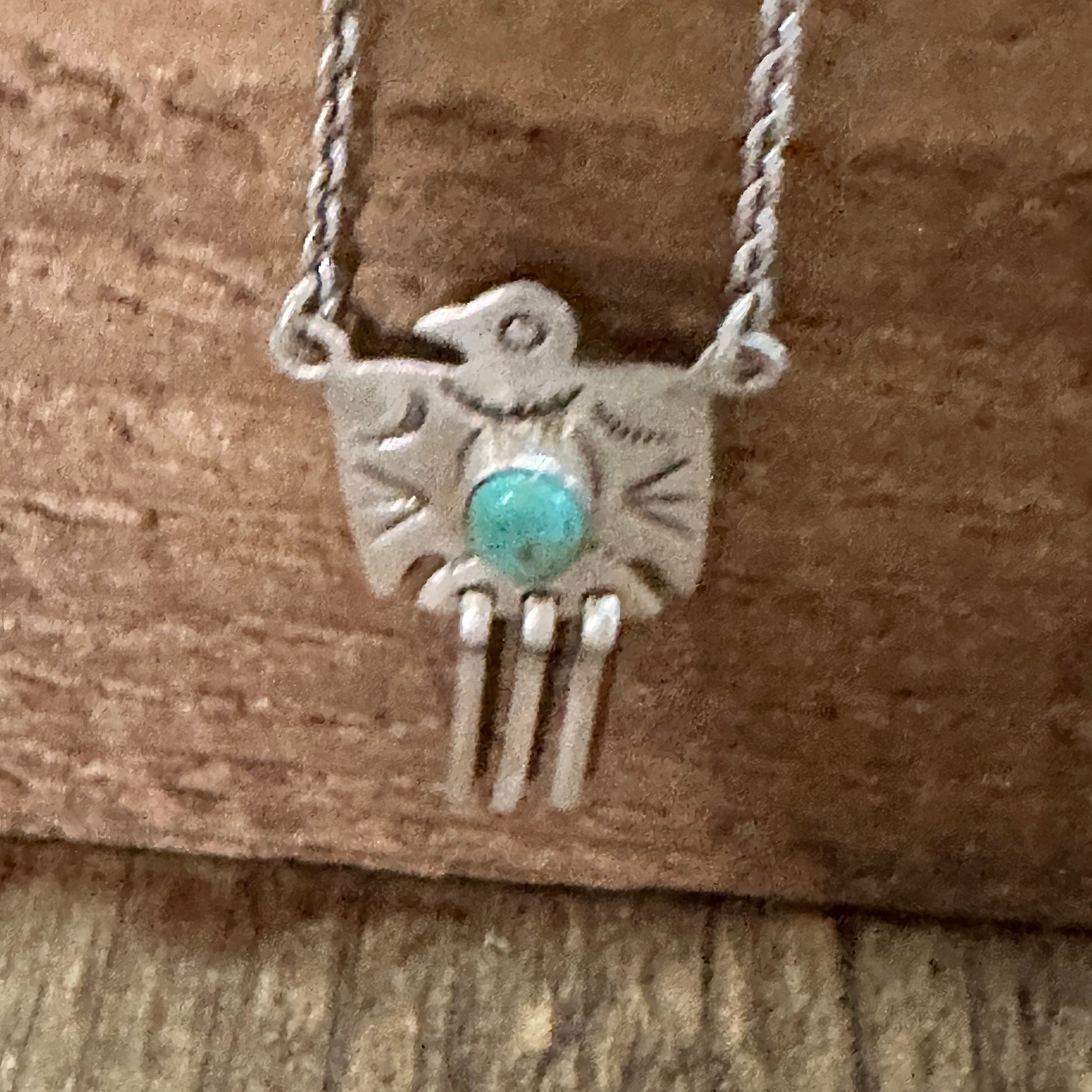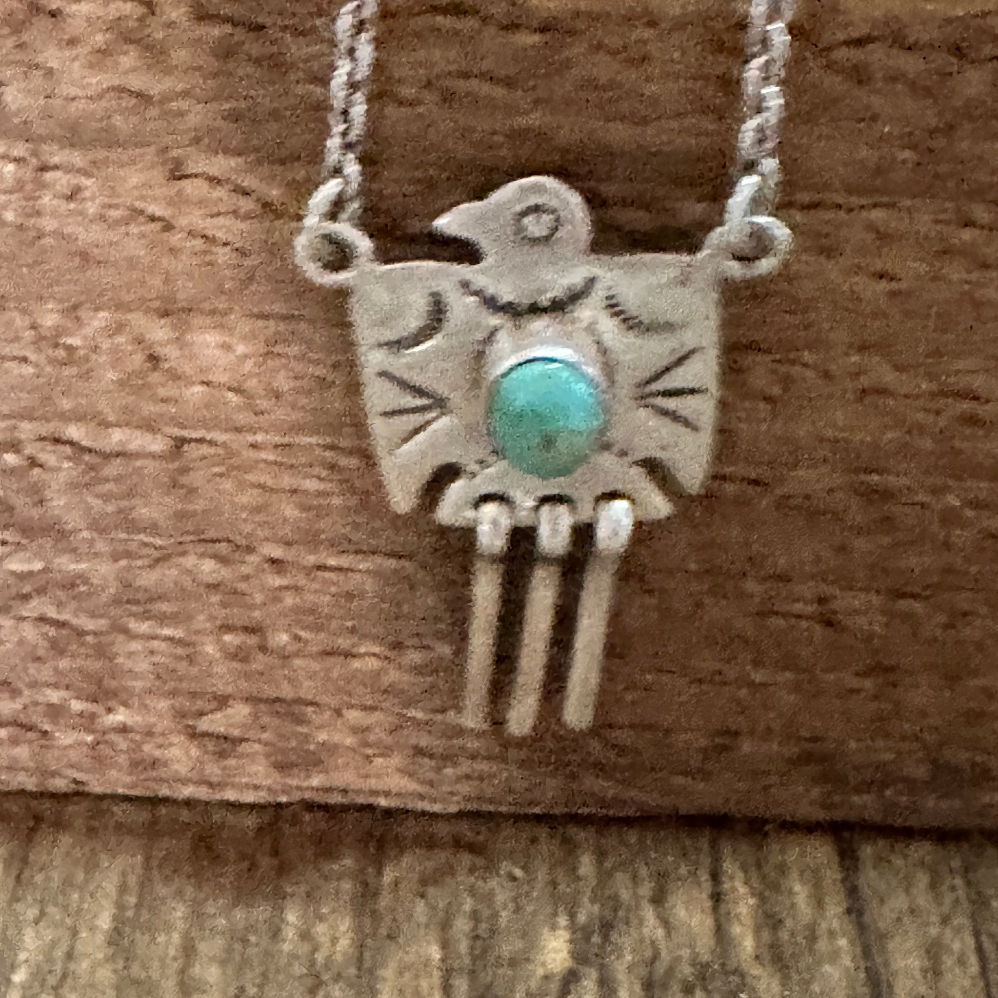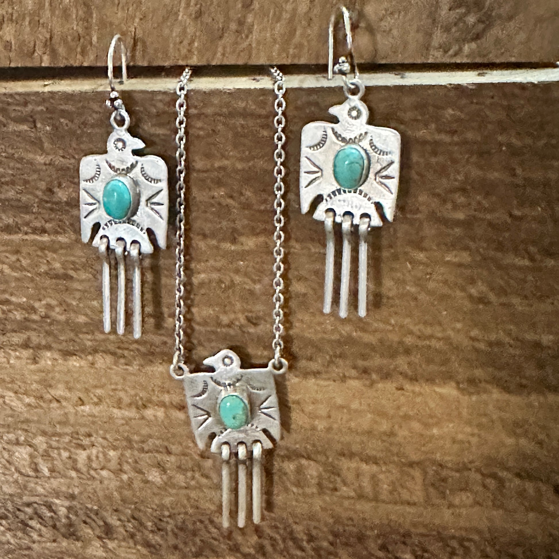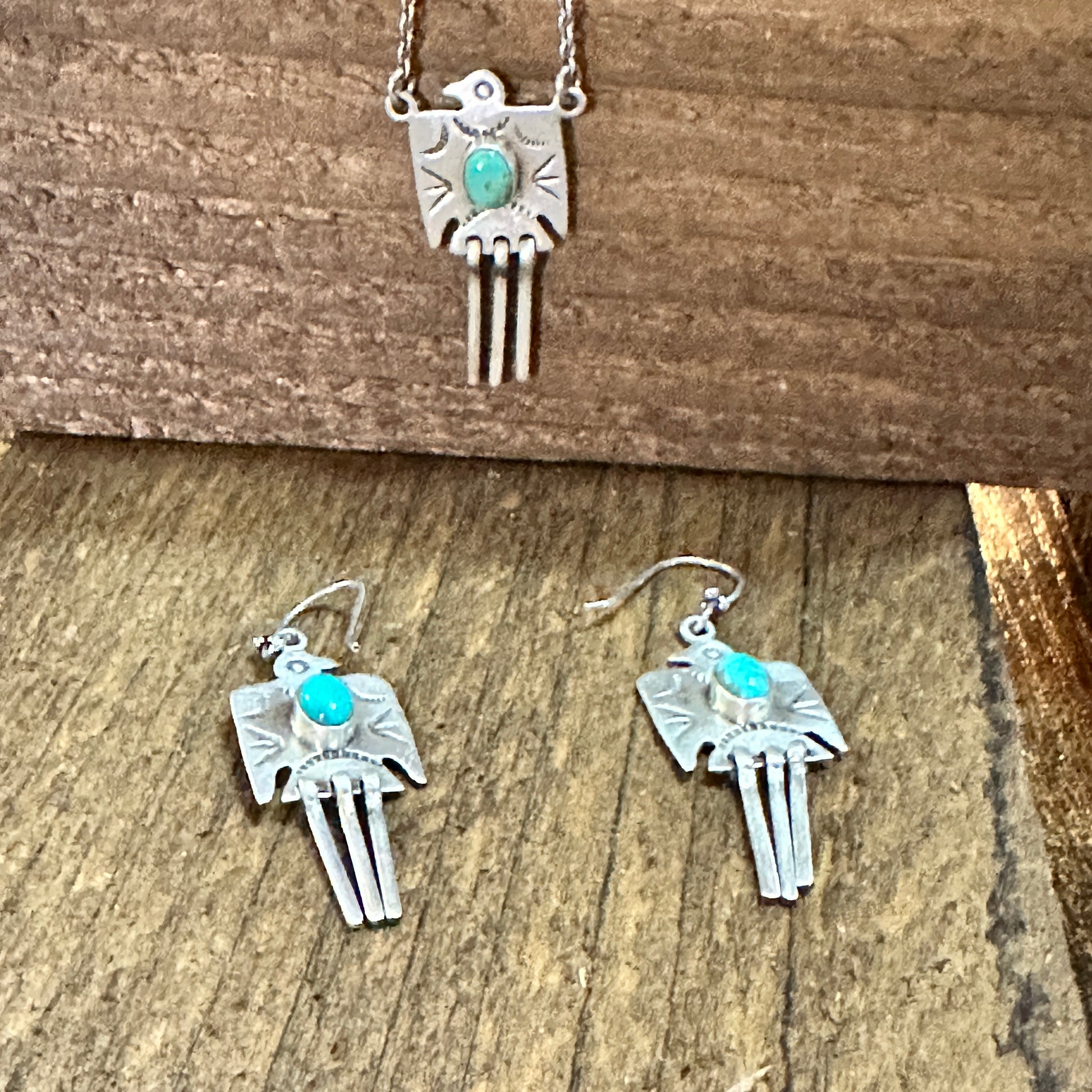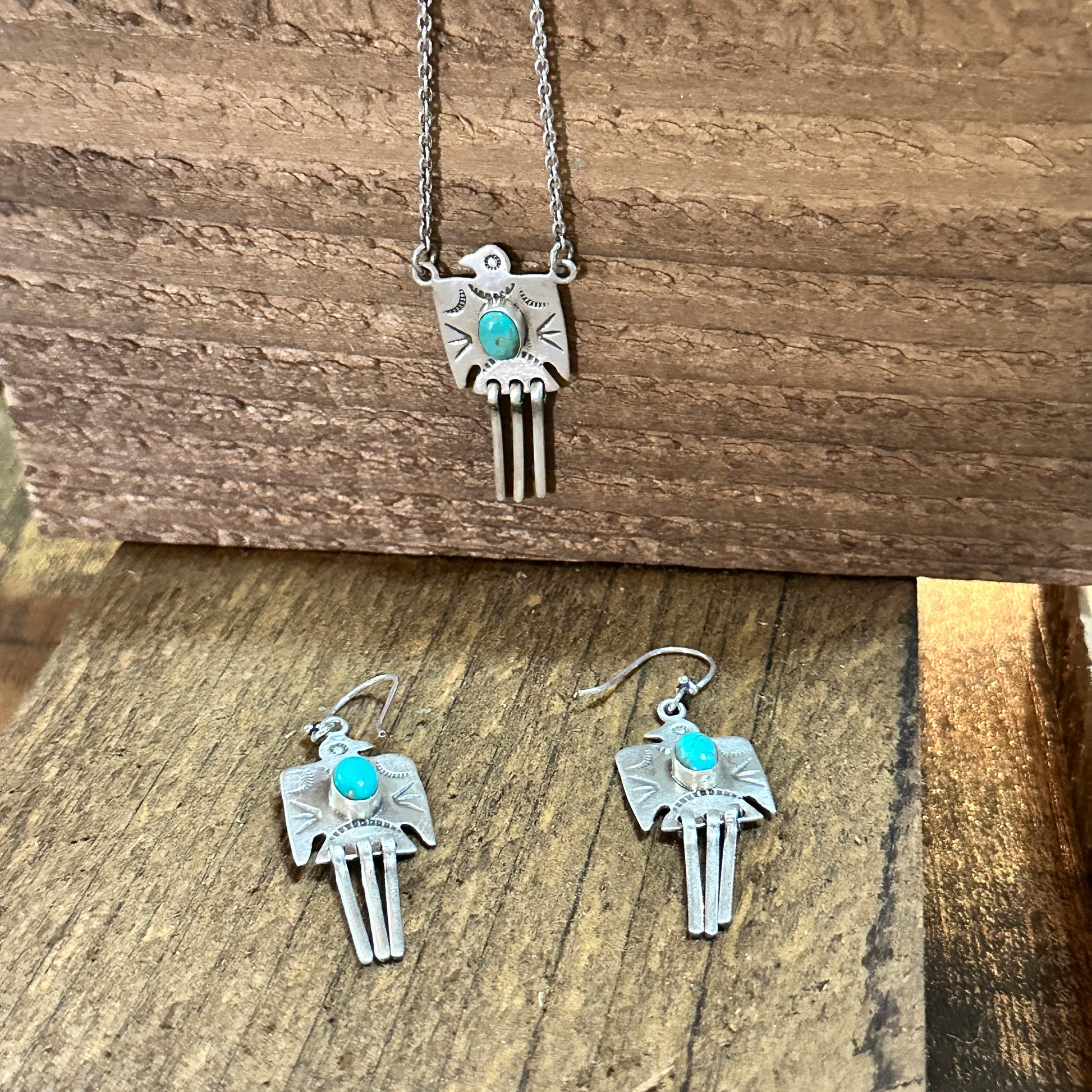 Handmade Kingman Turquoise Dangle Thunderbird Necklace Set Sterling Silver