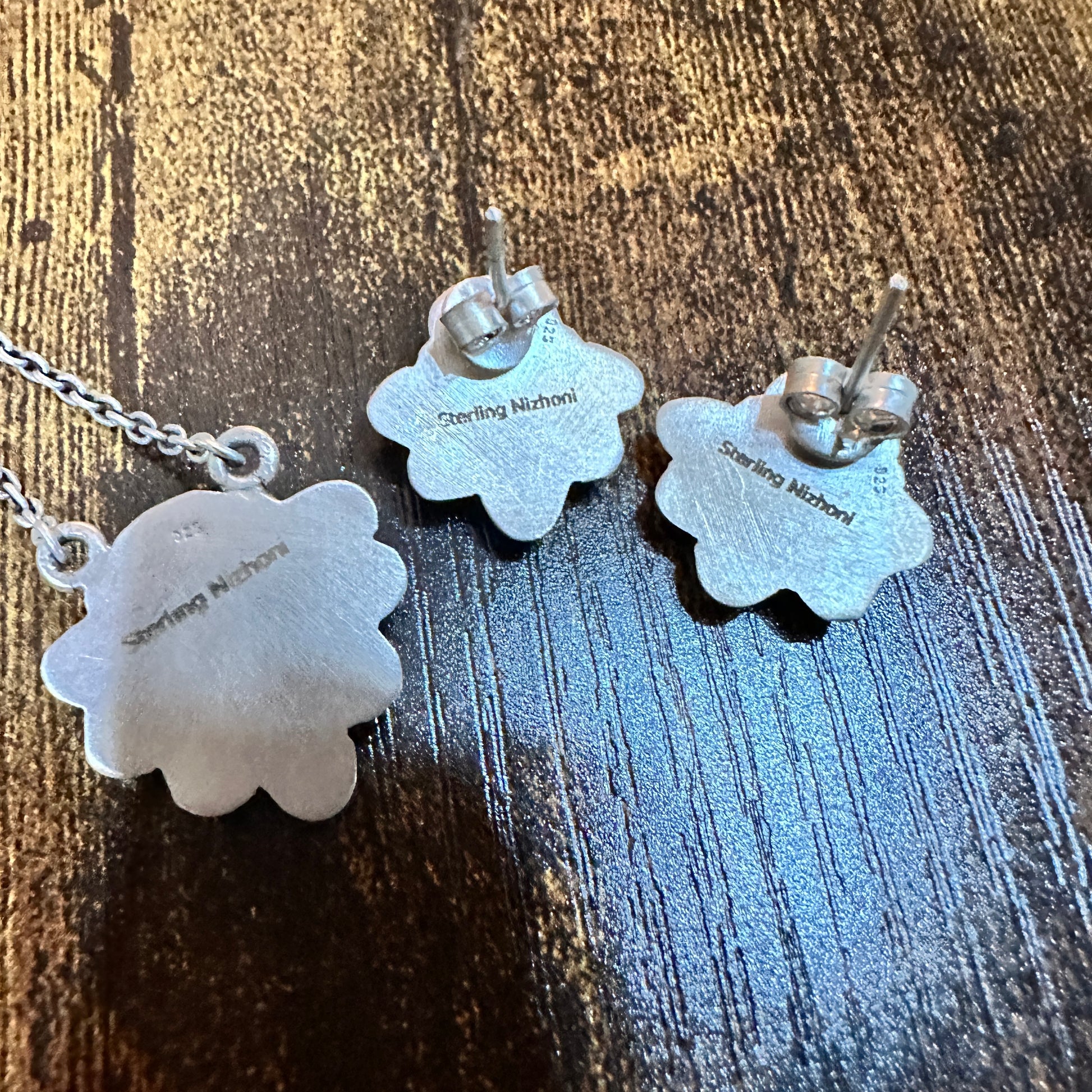 - Exquisitely handmade sterling silver necklace and matching post earrings, each adorned with vibrant Purple Mojave turquoise and signed by Nizhoni.