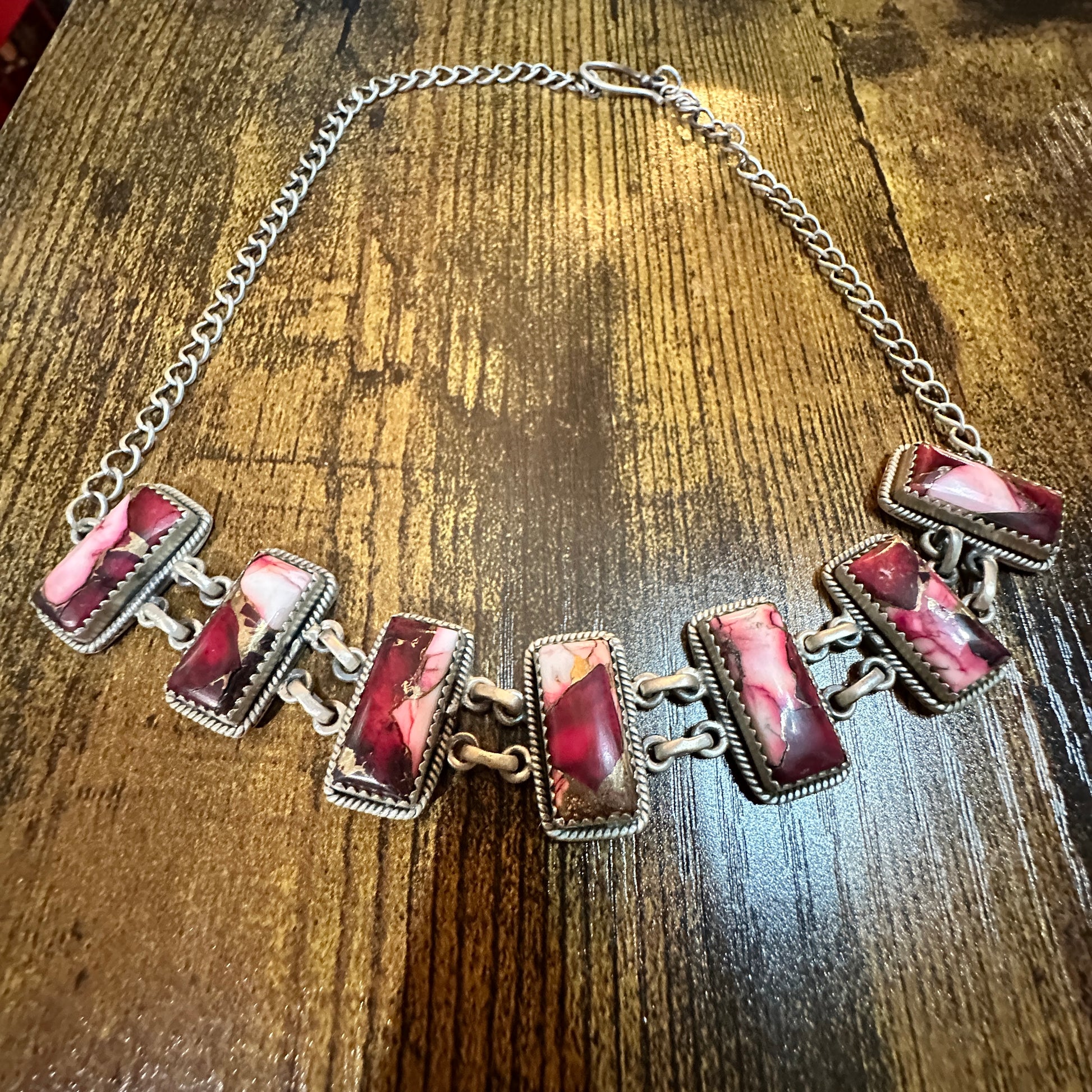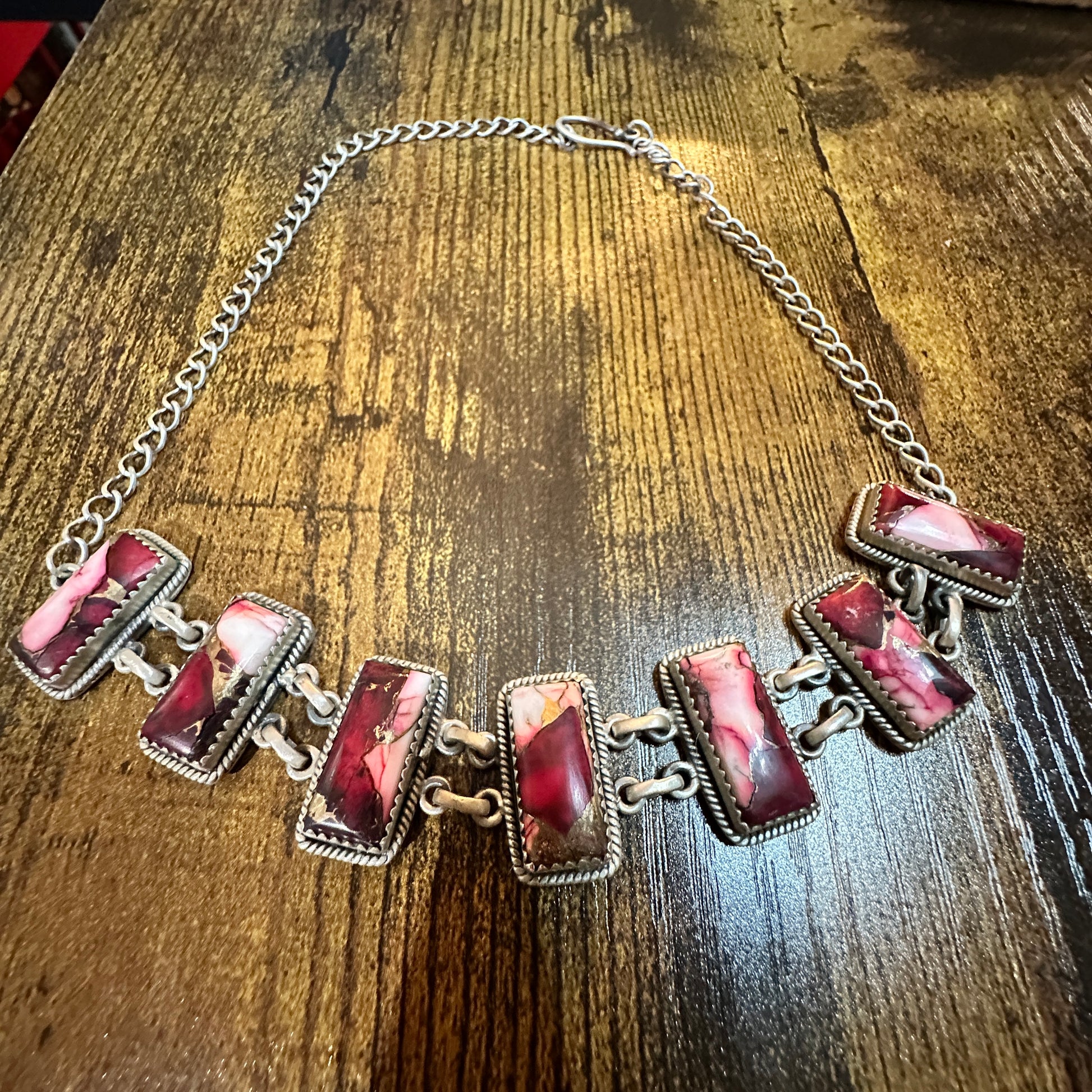 Handmade sterling silver choker featuring a bold red rose-dahlia design, signed by Nizhoni for authentic craftsmanship.