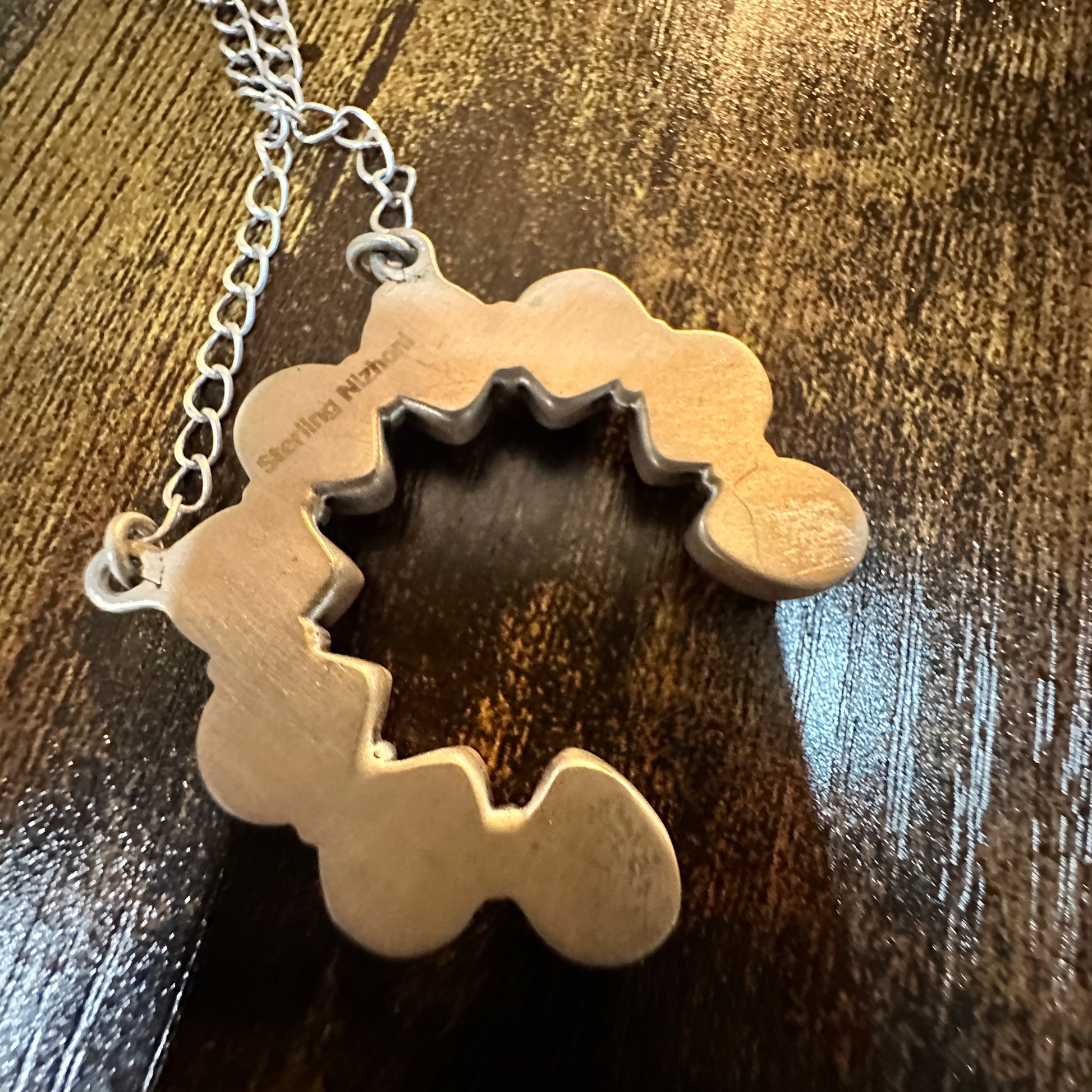 Concise, SEO-friendly description of a handmade sterling silver necklace featuring a rose dahlia motif merged with the Naja squash symbol, signed by Nizhoni.