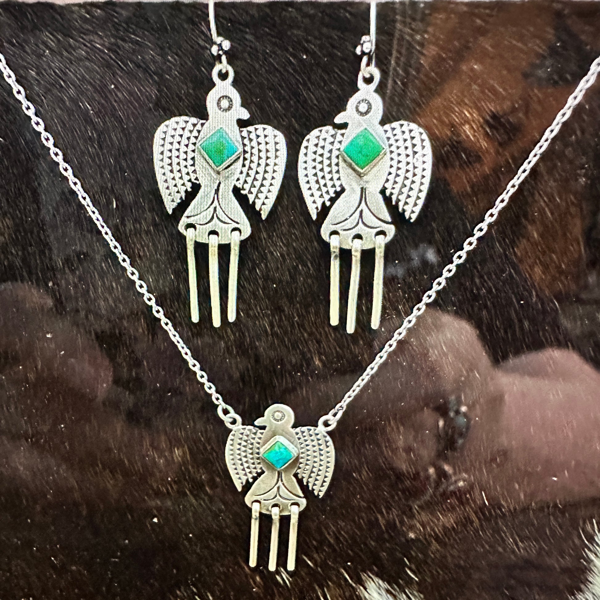 Sterling Silver Kingman Turquoise Dangle Thunderbird Necklace and Earrings Set