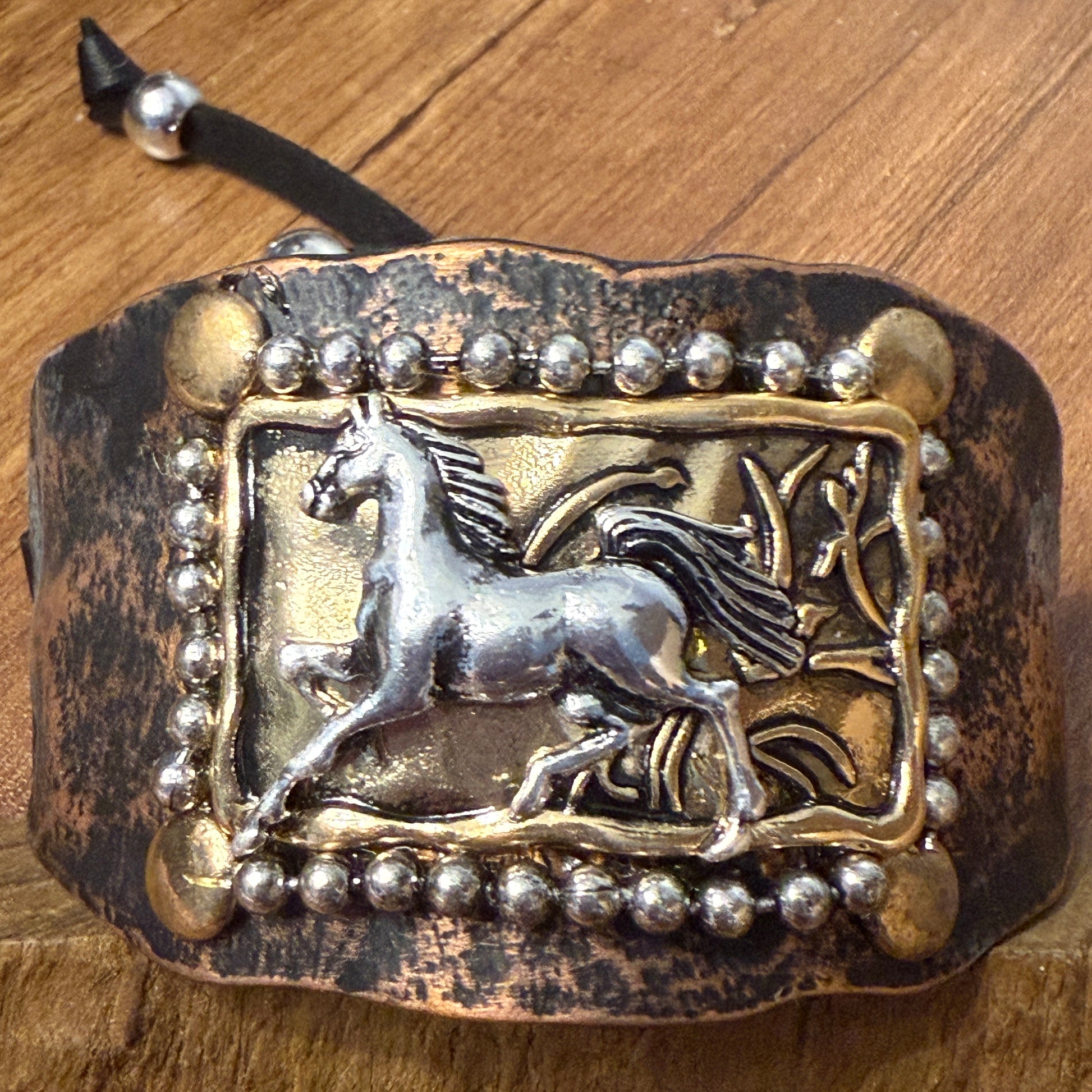 Horse Cantering Western Bracelet Cuff In Brown Leather With Vintage Copper Plate