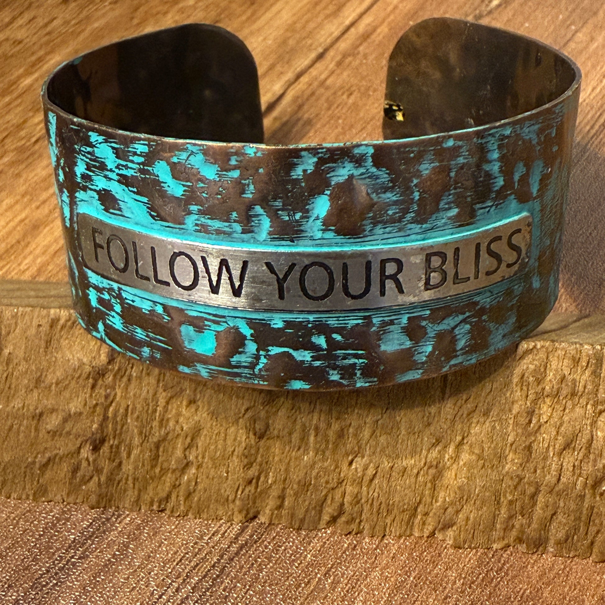 Message FOLLOW YOUR BLISS Metal Western Cuff Bracelet With Patina Rustic Inscriptions