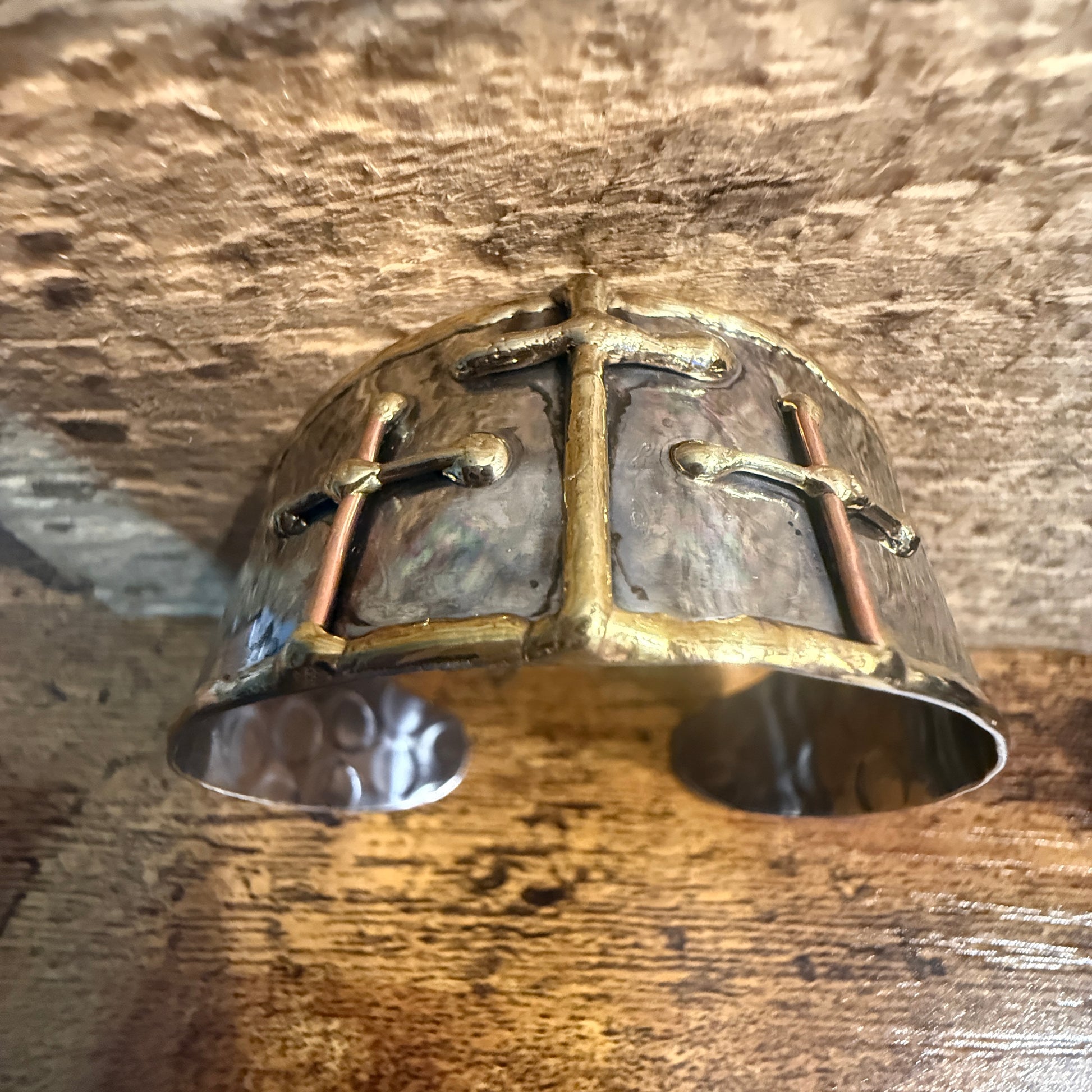 A handcrafted mixed-metal cuff bracelet featuring three gold crosses, blending copper, brass, and stainless steel for a timeless, versatile statement piece.