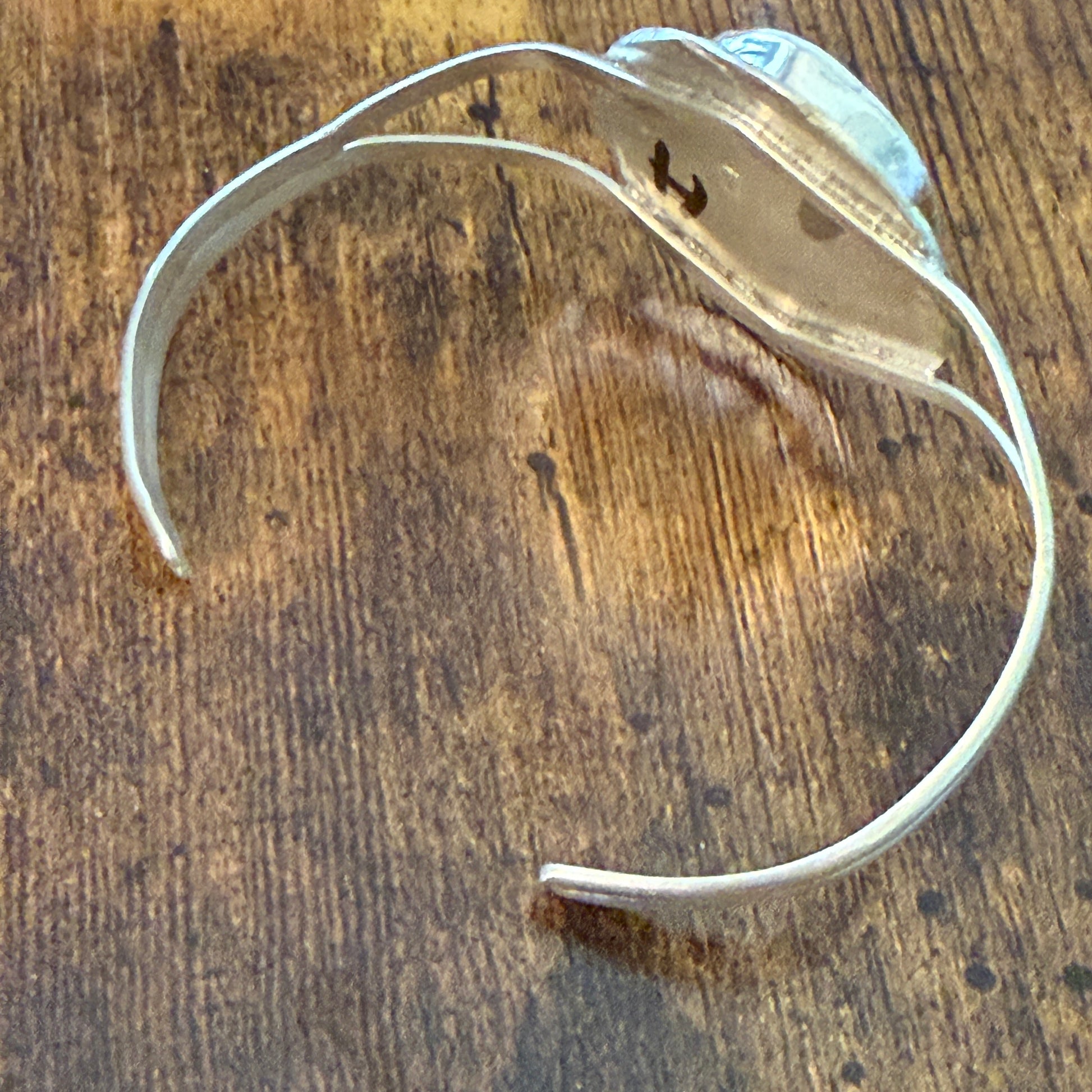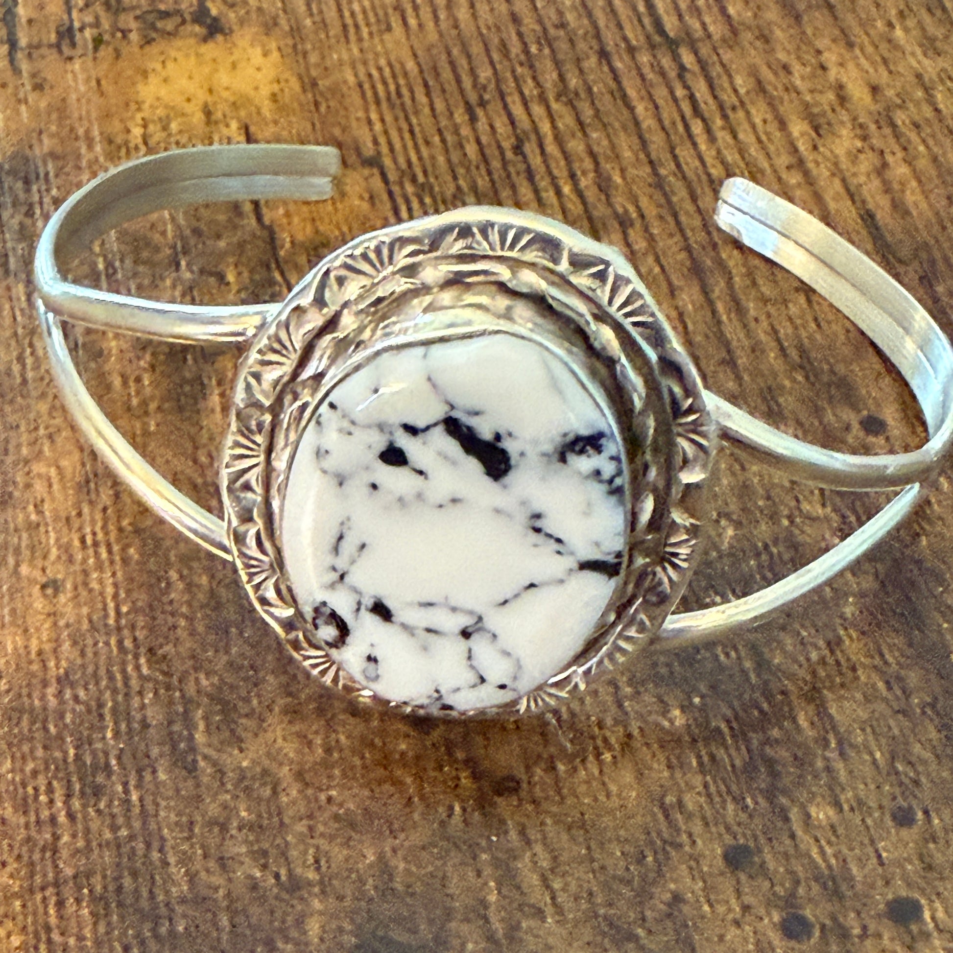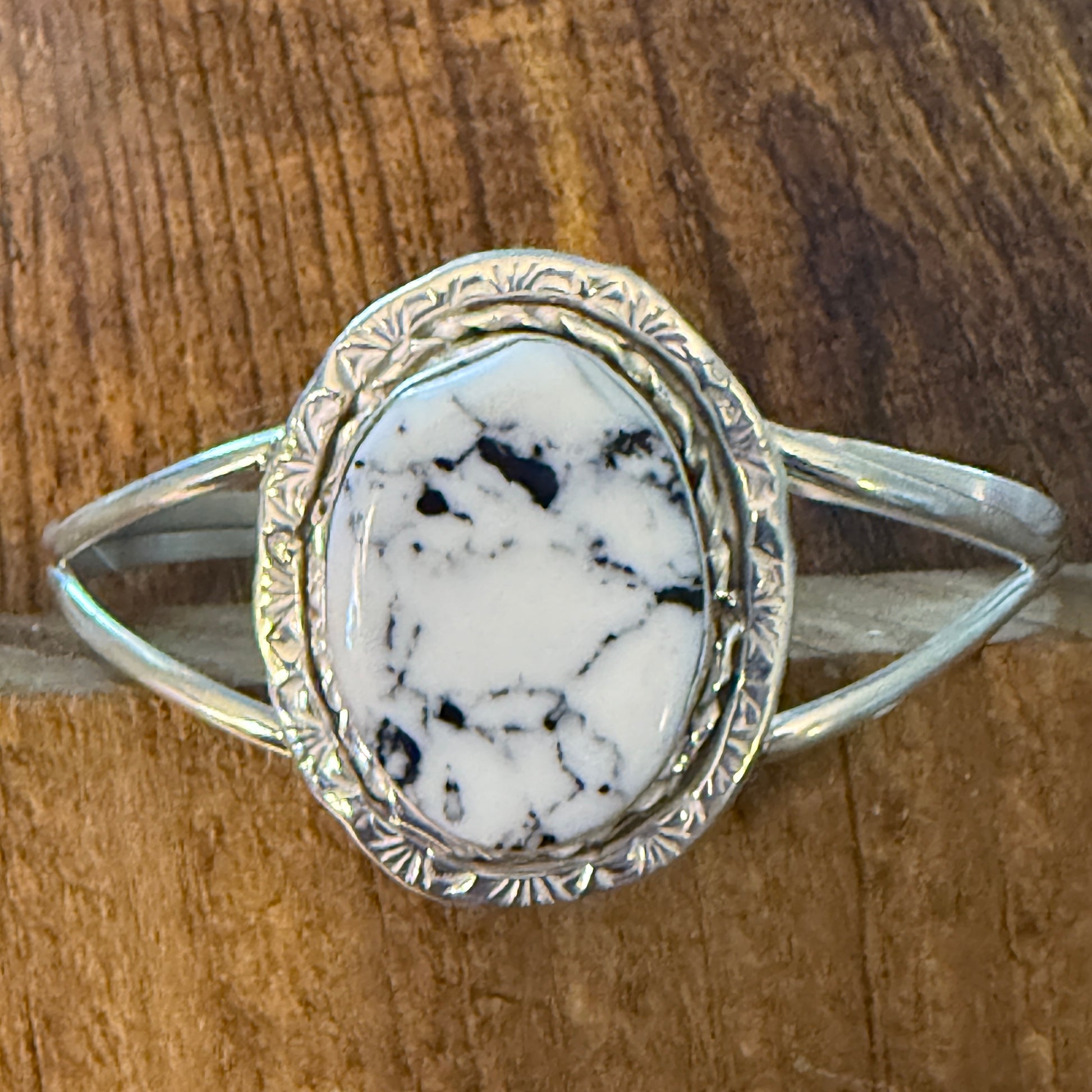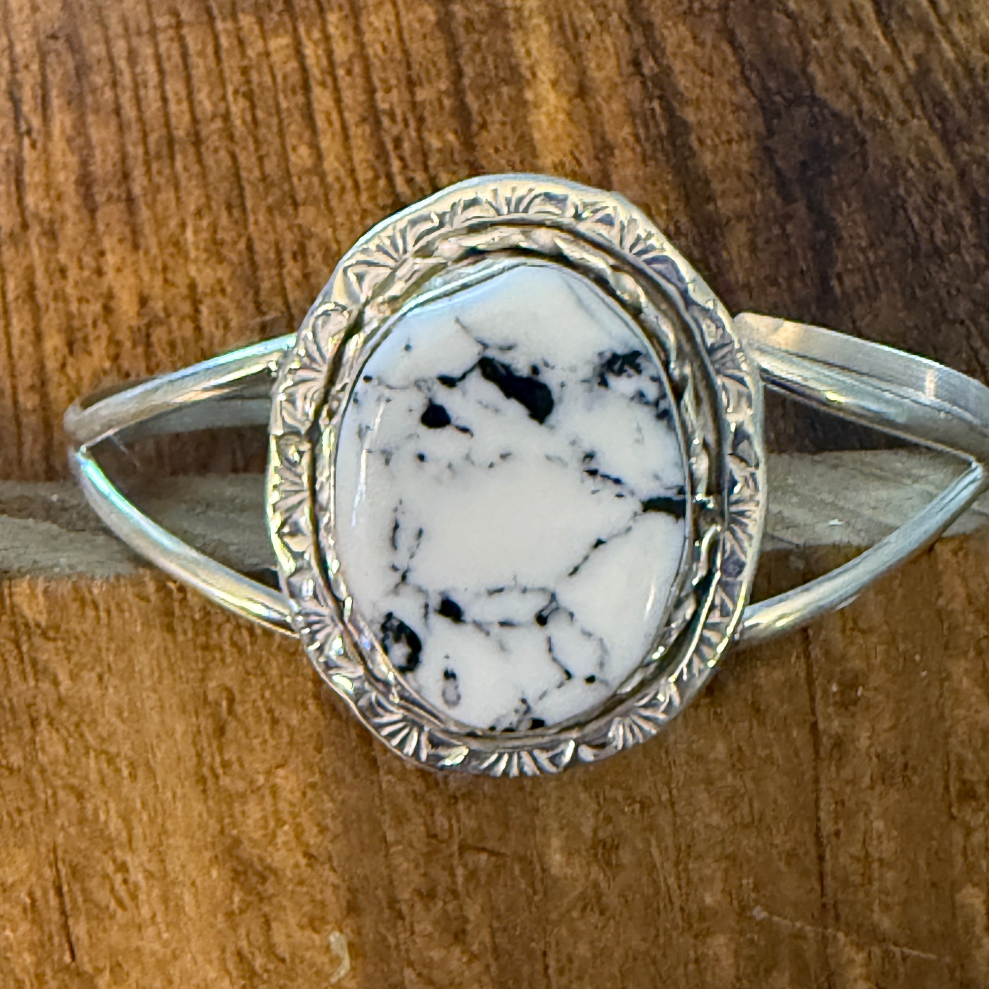 This Sterling Silver white Buffalo turquoise cluster bracelet / cuff by Mike Dedman the artist measures 5 1/4 " from tip to tip inside with a gap-opening of 1 " so it should fit any wrist around 5 1/4 to 6 3/4 inch wrist give or take they weigh approximately 12 grams