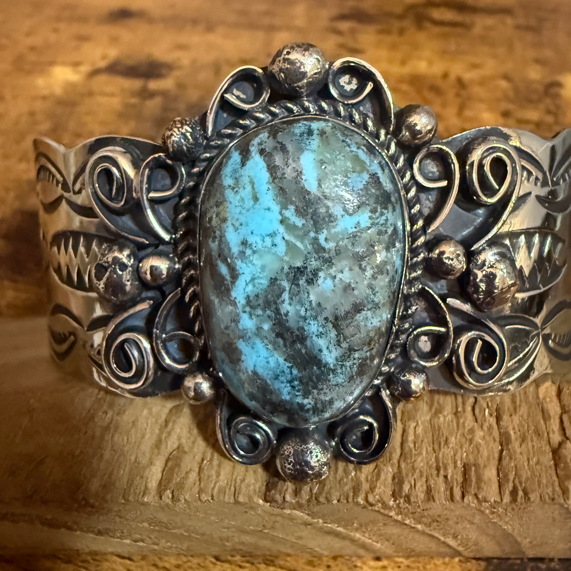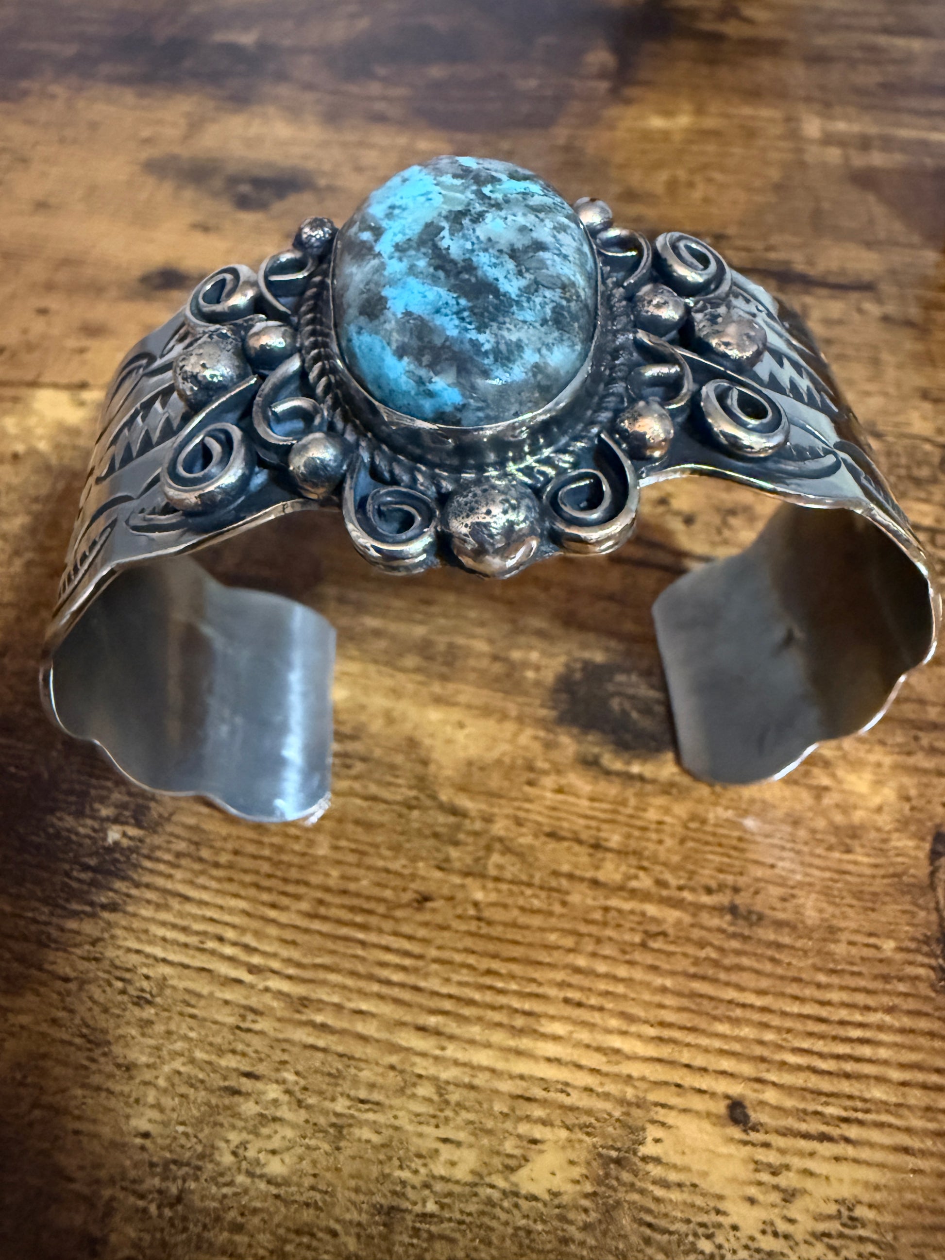 - Authentic Native American turquoise set in a sturdy nickel silver cuff, signed by renowned artist Jackie Cleveland.