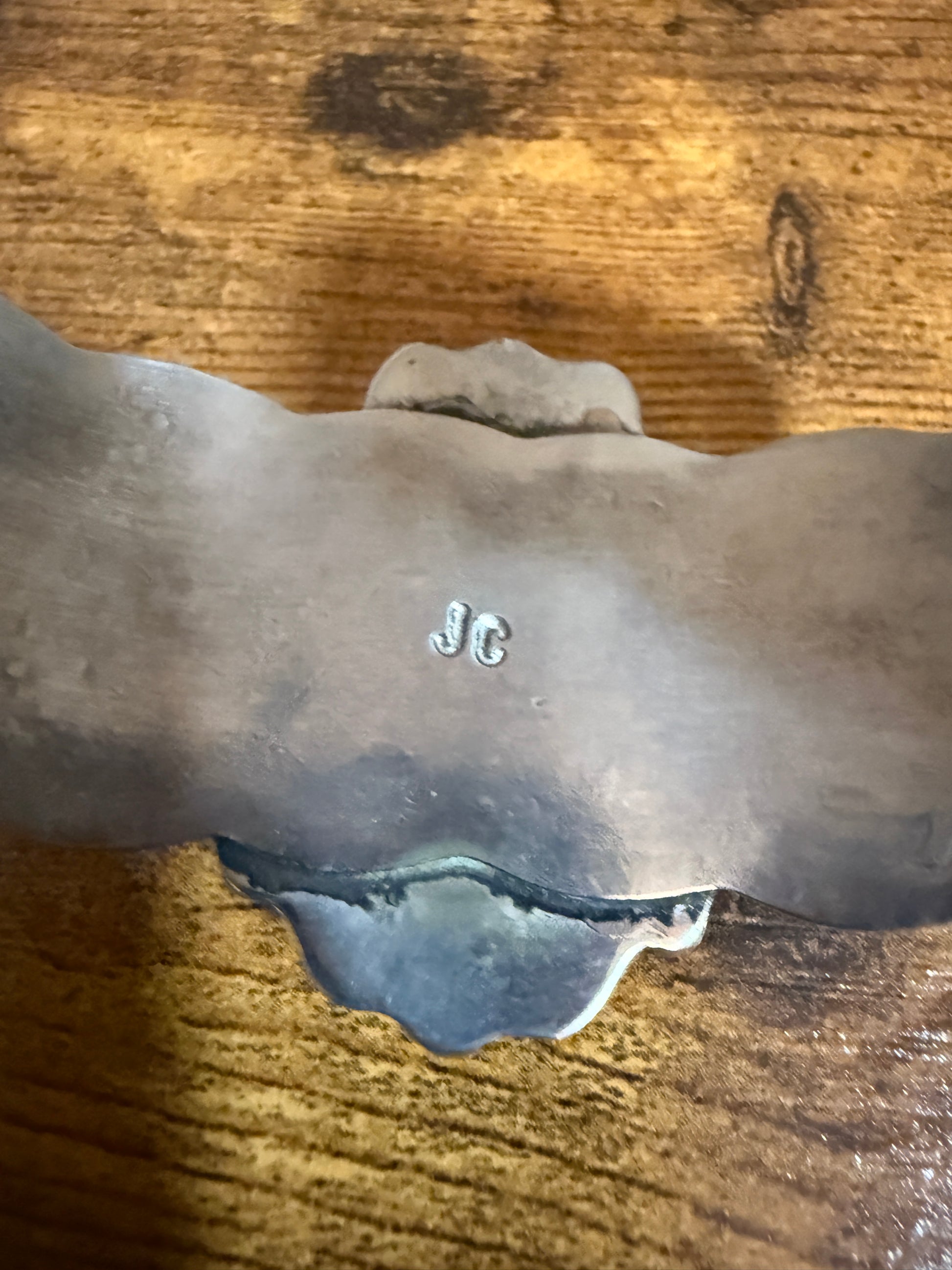 Elegant and collectible Native American turquoise cuff bracelet in nickel silver, signed by Jackie Cleveland, blending rich heritage with modern wearability.