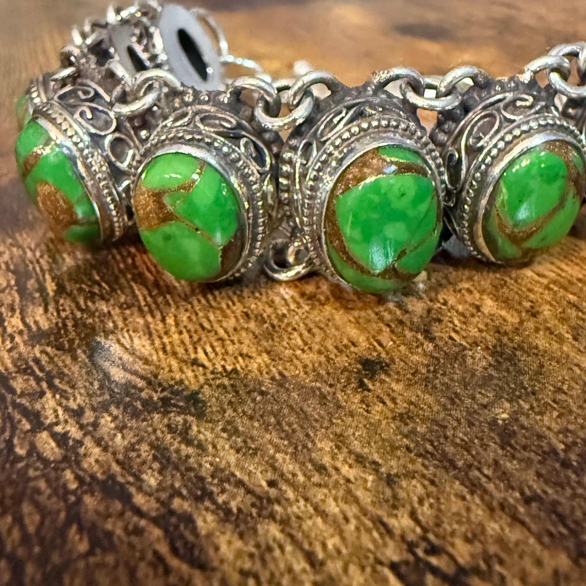 - Natural green copper Dalhia turquoise links accented with 925 sterling silver create a distinctive vintage bracelet that gleams with character.