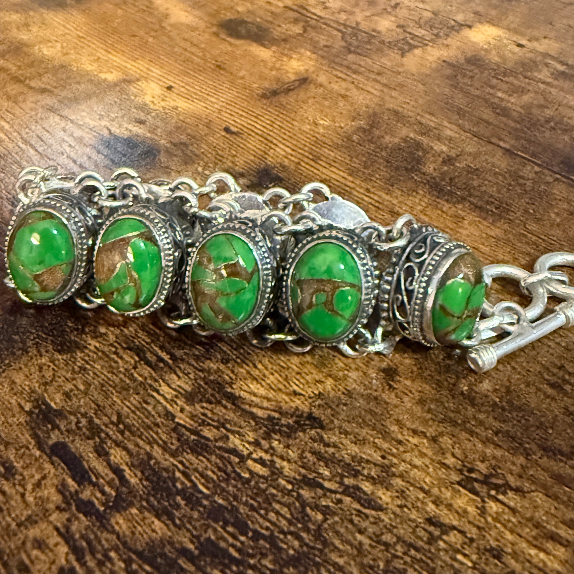 Natural Green Copper Dalhia Turquoise Link 925 Sterling Silver Vintage Bracelet
