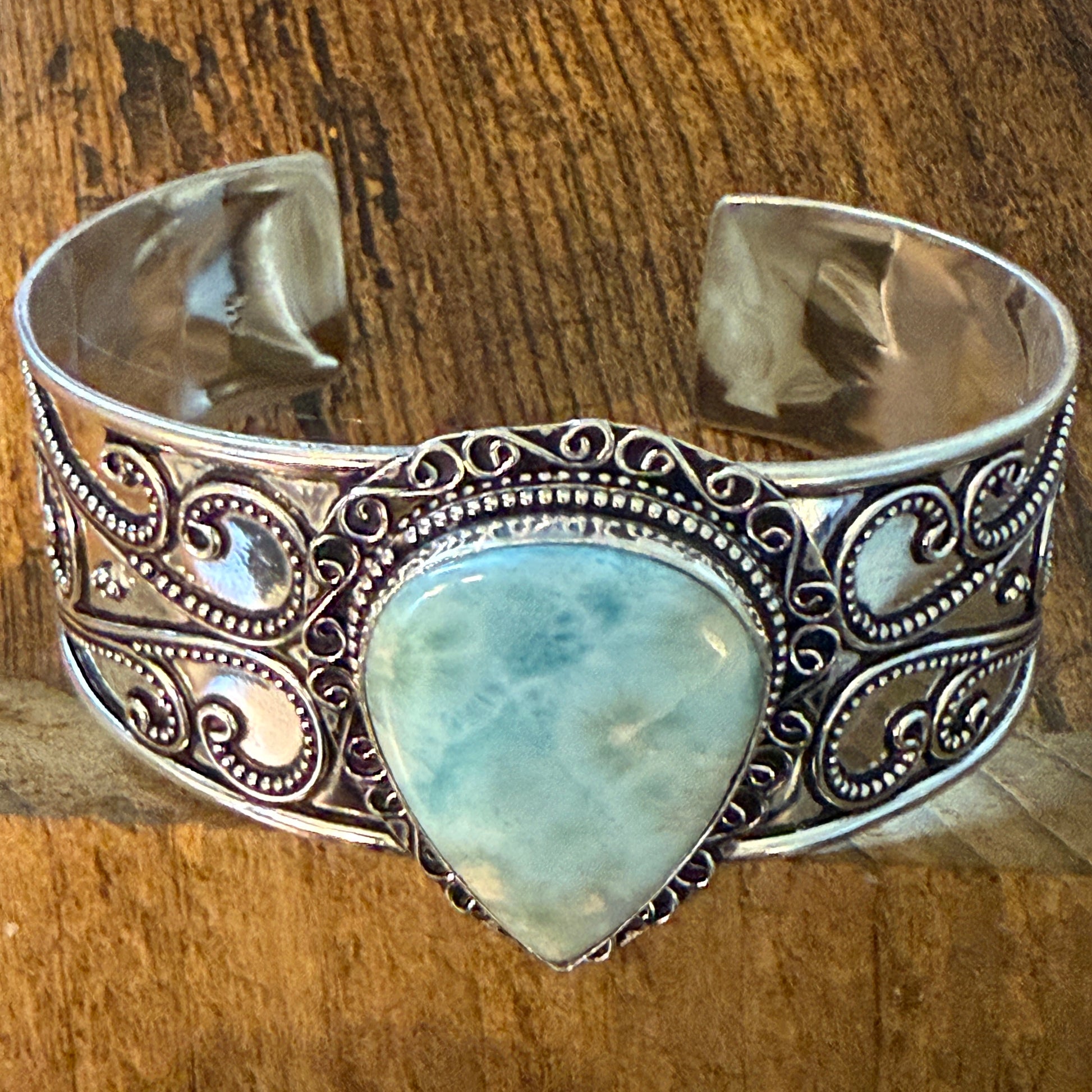Experience the tranquil allure of the sea with the Natural Republic Larimar Gemstone 925 Sterling Silver Cuff Bangle. This adjustable bracelet fuses a unique larimar gemstone with timeless sterling silver, offering a piece that is as versatile as it is captivating.