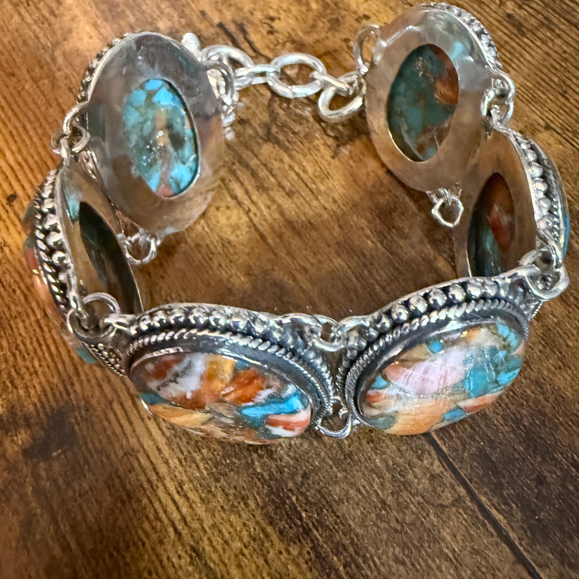 - Natural Spiny Oyster centerpiece with copper accents and turquoise hues, crafted into a classic sterling silver vintage link bracelet.
