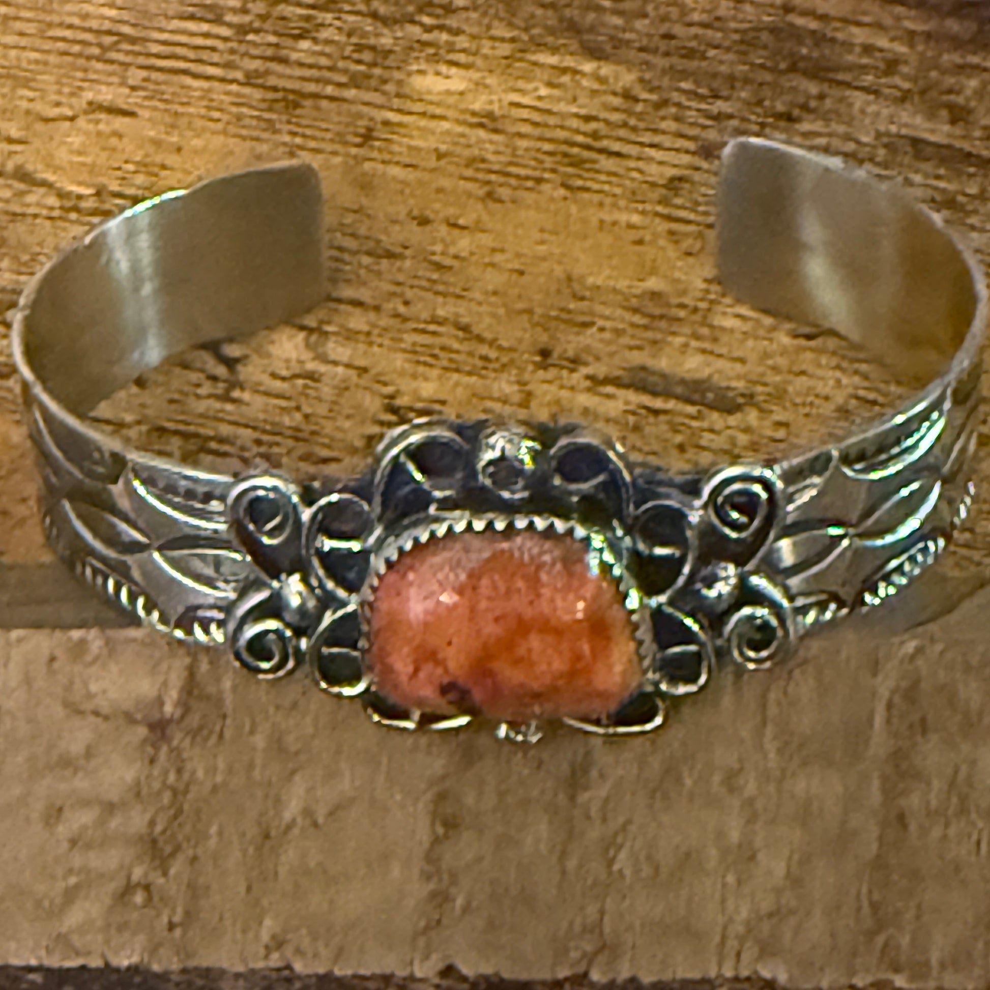 Navajo Apple Coral Cuff Bracelet Signed Cleveleland Nickel Silver Adjustable